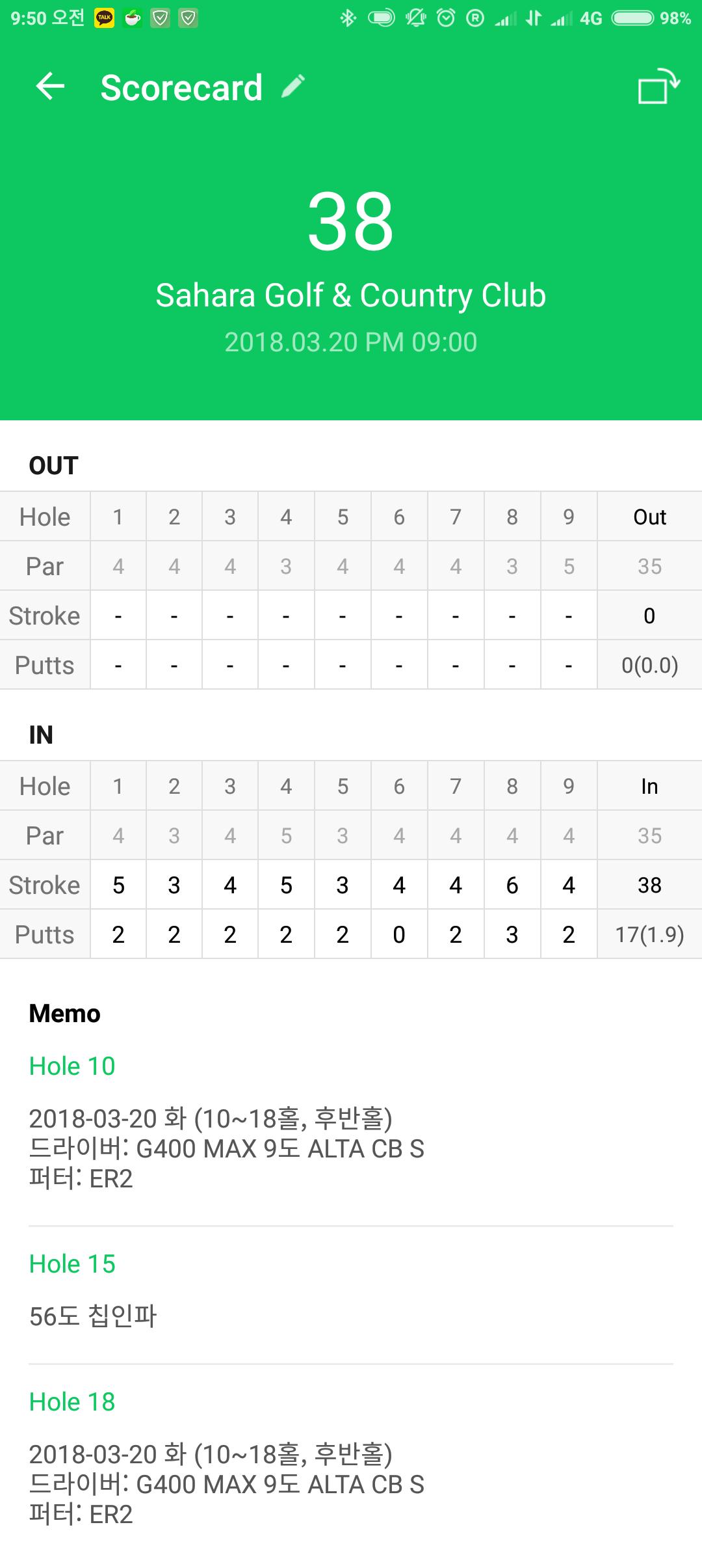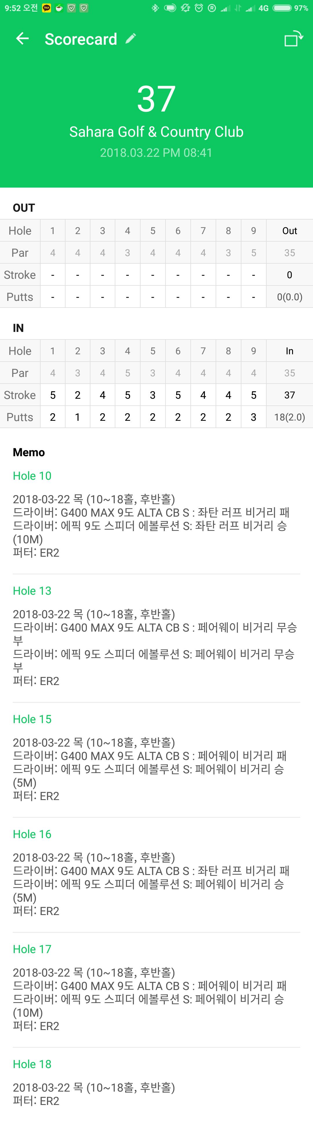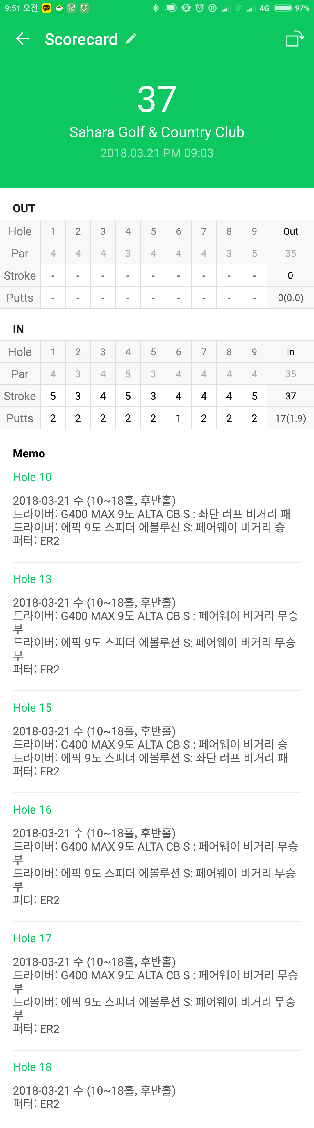5. 성능: 필드 기준으로 똑같습니다. ER2와 ER3 모두 9홀 기준 퍼터수 1.9 정도 나옵니다. 결과값이 동일해서 ER2 로 플레이 한것만 올렸습니다. (밑에 결과값 참고) 저 이후 날짜에는 테일러메이드 스파이더 투어 블랙 34인치로 플레이 했기 때문에 ER2 결과만 올렸습니다. (매일 밤 라운딩을 하고 있고 후반만 라이팅이 있어서 스코어 어플에 후반만 표기된 것입니다.)