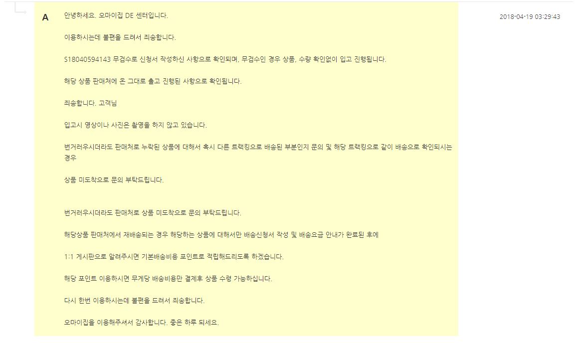 24시간이 다 되어서야 온 오마이집의 답변은 고객이 무검수로 선택해서 판매처에서 받은 제품 그대로 보냈다.