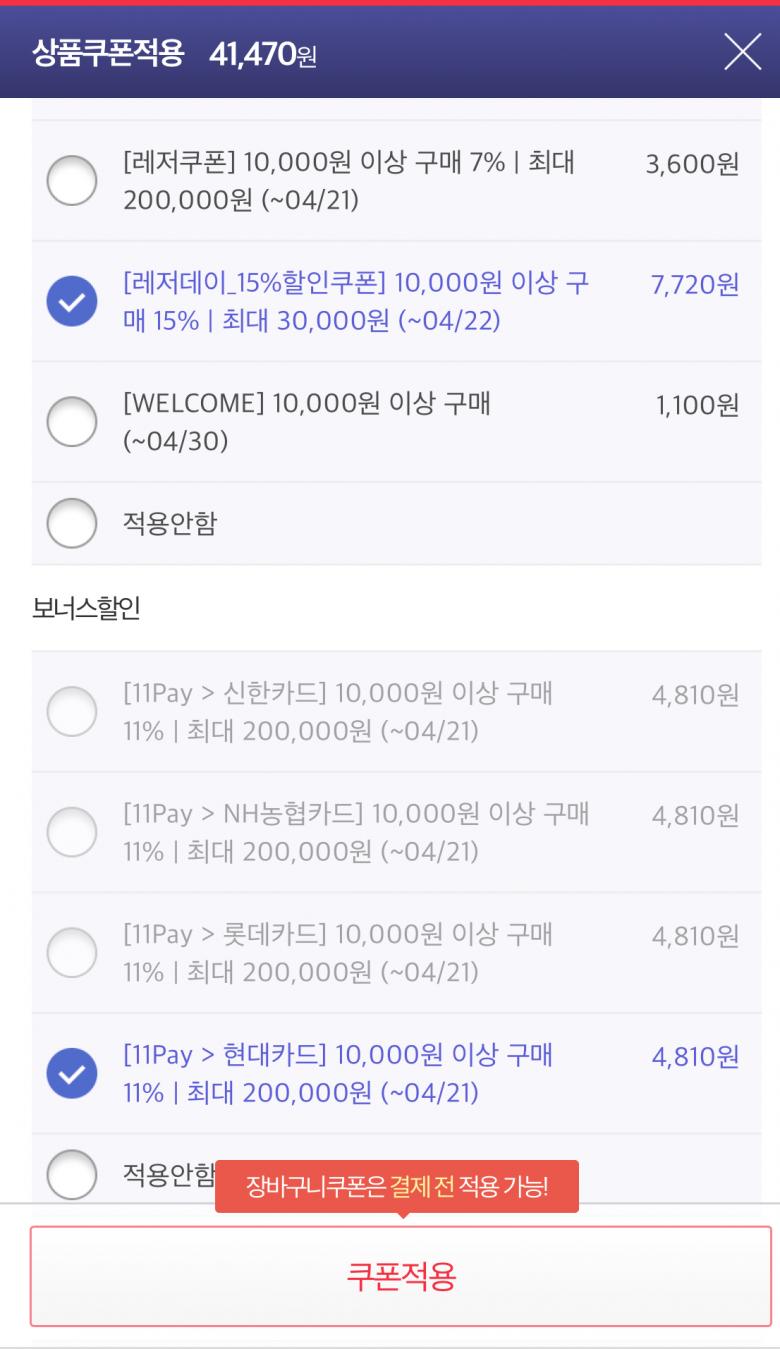 4개 카드사 11% 할인쿠폰 있습니다.