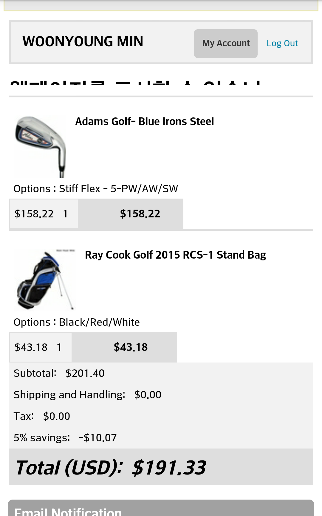 사악하게도 200달러가 살짝 넘어서 혹시나 5%할인코드인 ultimate 먹여보니 장바구니에선 적용되네요.... 결재까진 진행 안했습니다만, 진행되면 8아이언에 스탠드백을 약 28만 내외로 구성하실수 있을것같습니다...