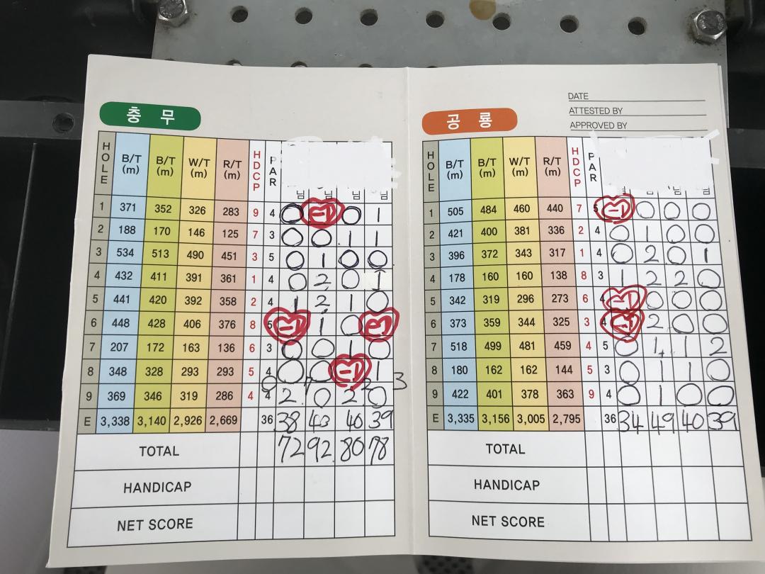 공룡 +10 충무 +5면 15라 87인듯 한데 공룡 7번홀 1밑에 +표시가 되어 있는게 양파란건지...