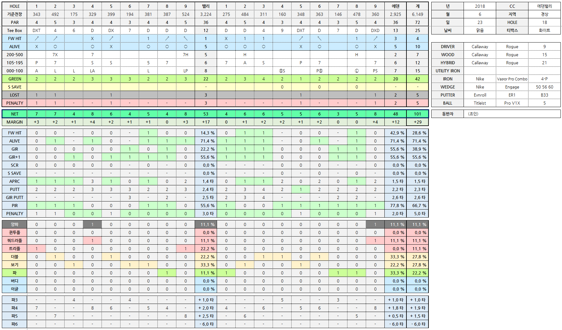 구력은 이제 1년 조금 넘었구요, 백돌이입니다. 공은 잘 못치는데 제가 어떻게 치고있나 통계내고 기록하는걸 좋아하다보니 아래처럼 정리를 하고있습니다. 가장 최근 라운드네요.