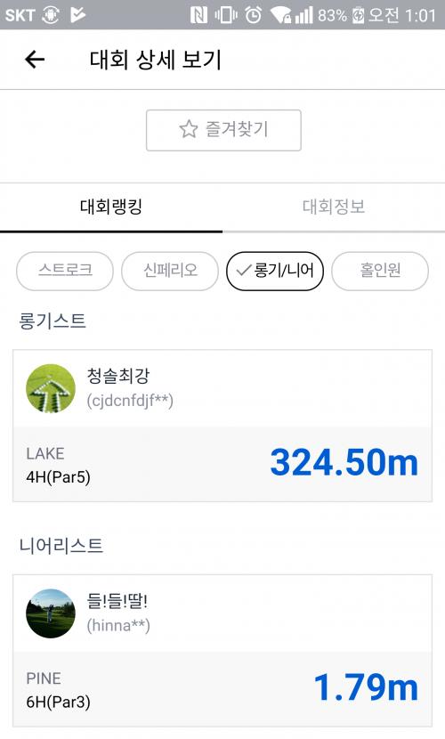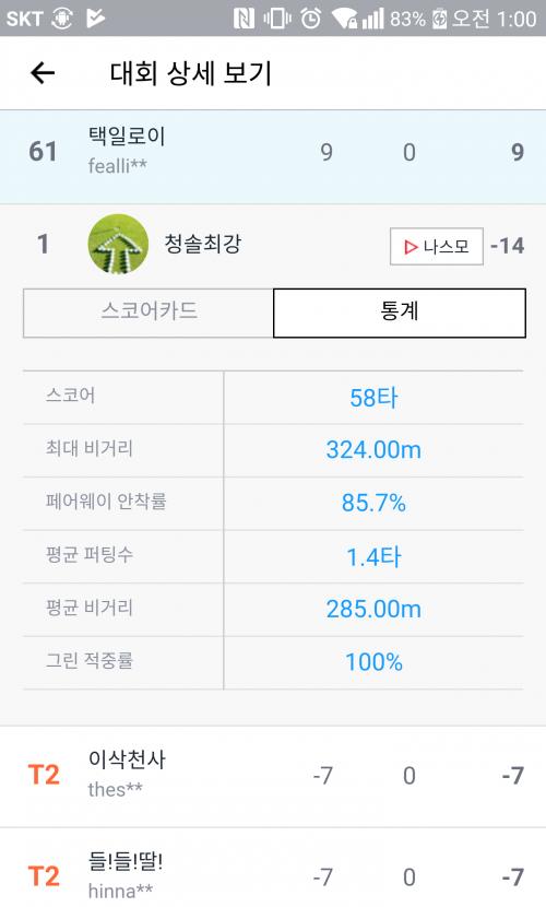 아까 심심해서 대회 쳐봤는데 저분 롱기 깬다고 깝죽대다가 망했습니다 ㅋㅋㅋㅋ 3언더 인가 치고 있다가 13홀 롱기홀에서 오비 ㅎㅎ 이후부터 템포 흐트러져서 망했어요. 저분은 진짜 대단하신듯;;