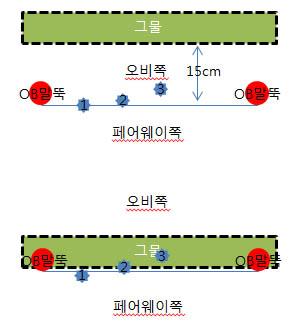 그림을 보시면 첫번째 그림은 오비말뚝과 그물이 약 15cm정도 간격이 있습니다.