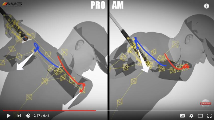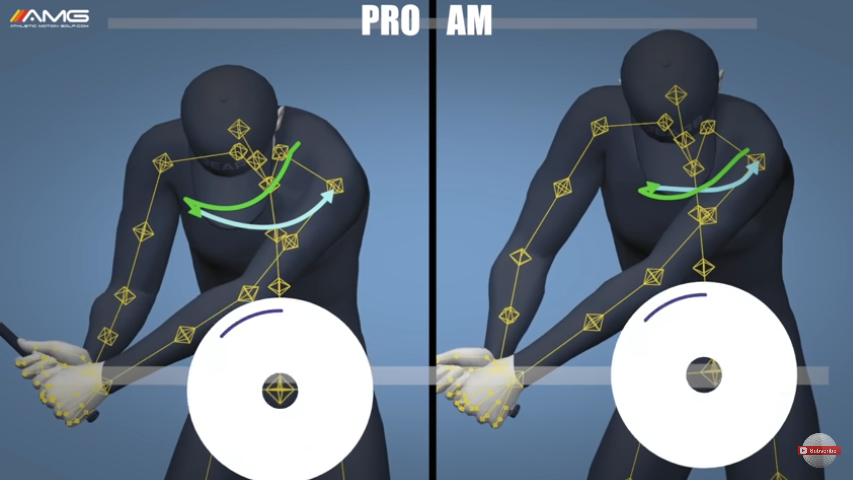 다운스윙시 왼쪽어깨가, 프로는 저 호를 그는 화살표처럼 더 밑으로 파고들어서 내려가고