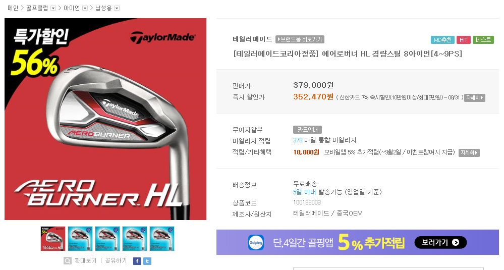 신품 에어로버너 아이언 us 스펙 4-9ps 35만원 vs