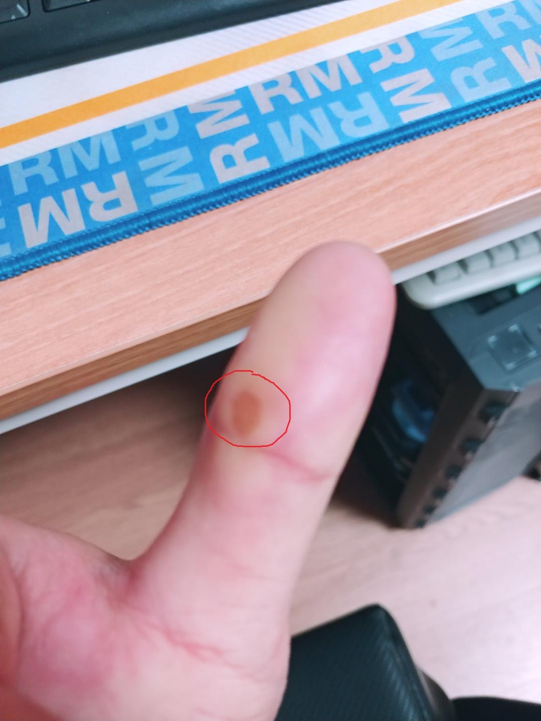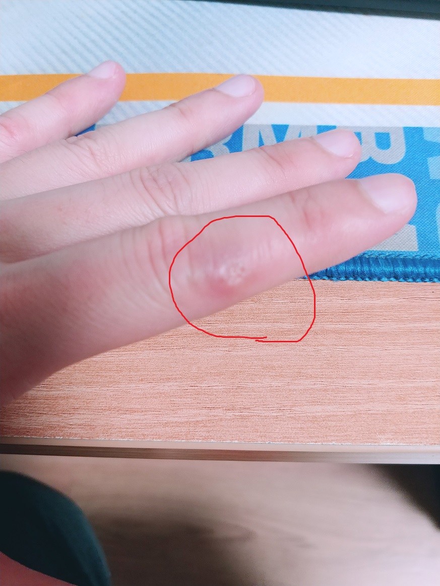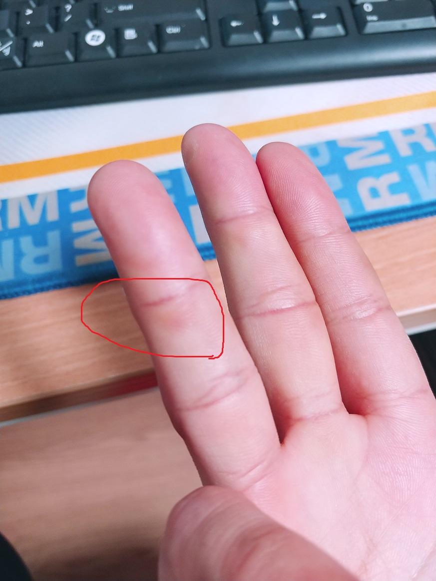 빨간 동그라미를 보면 넷째 손가락 마디 시작지점에 물집이 생겼다가 아물었습니다.(터트리지 않았어요)