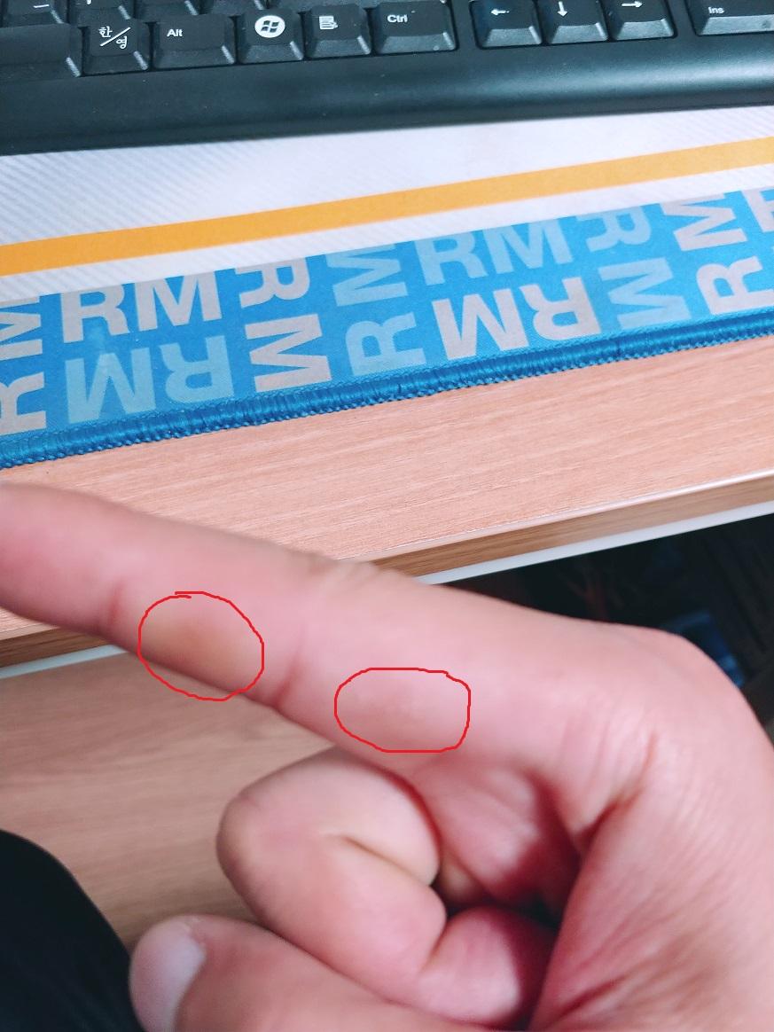 바람직한 오른쪽 중지/약지의 물집 위치가 현재의 제 위치가 손가락 안쪽면 이라 하셨는데, 저는 안쪽면 중에서도  일부마디에 집중적으로 생긴거군요