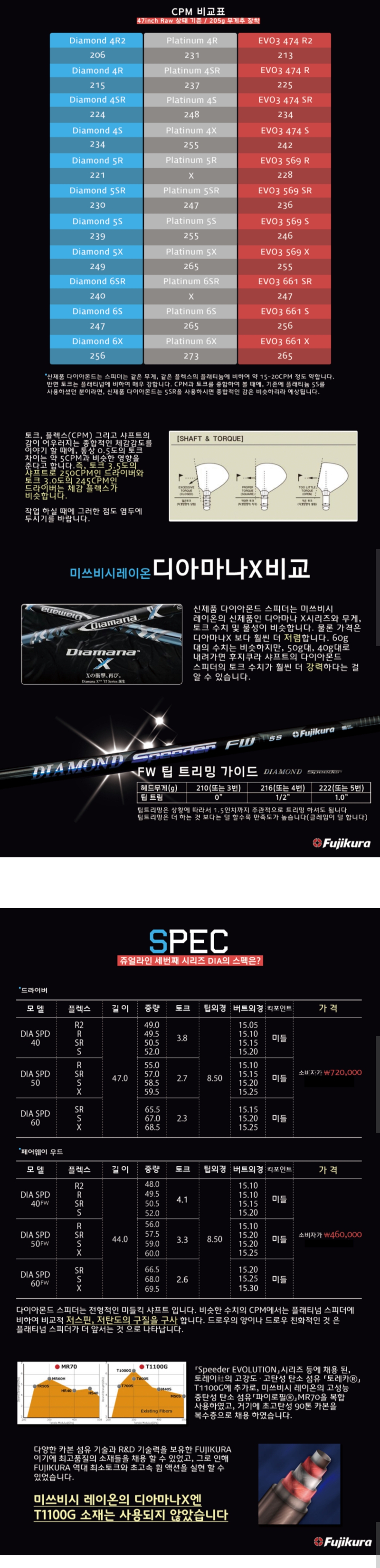 위 비교표에 나와있는 CPM은 47인치 RAW 샤프트일때의 측정값이라