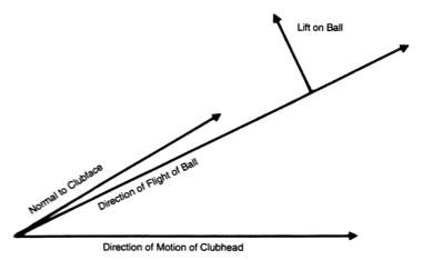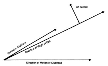 위 그림에서 핵심적인 두 벡터를 색깔로 구분한 것입니다. 파란색 화살표는 볼의 초기 발사방향이고, 노란색은 그에 수직인 양력lift 벡터입니다. 파란색 벡터는 페이스방향(빨간 화살표)에 훨씬 가깝지만 스윙궤적(검은 화살표)에도 약간 영향을 받습니다. 파란색 벡터의 크기가 클수록, 즉 볼스피드가 빠를수록 노란색 벡터도 커지고, 여기에 표현되지 않은 백스핀량이 클수록 노란색 벡터가 커집니다.