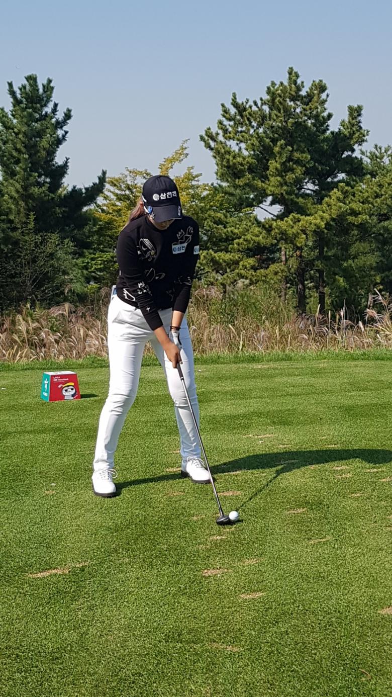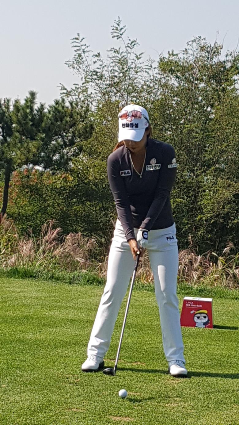 한발 정도 더 벌리고 치니...비거리가 더 늘어나서 그렇게 치고 있고요.