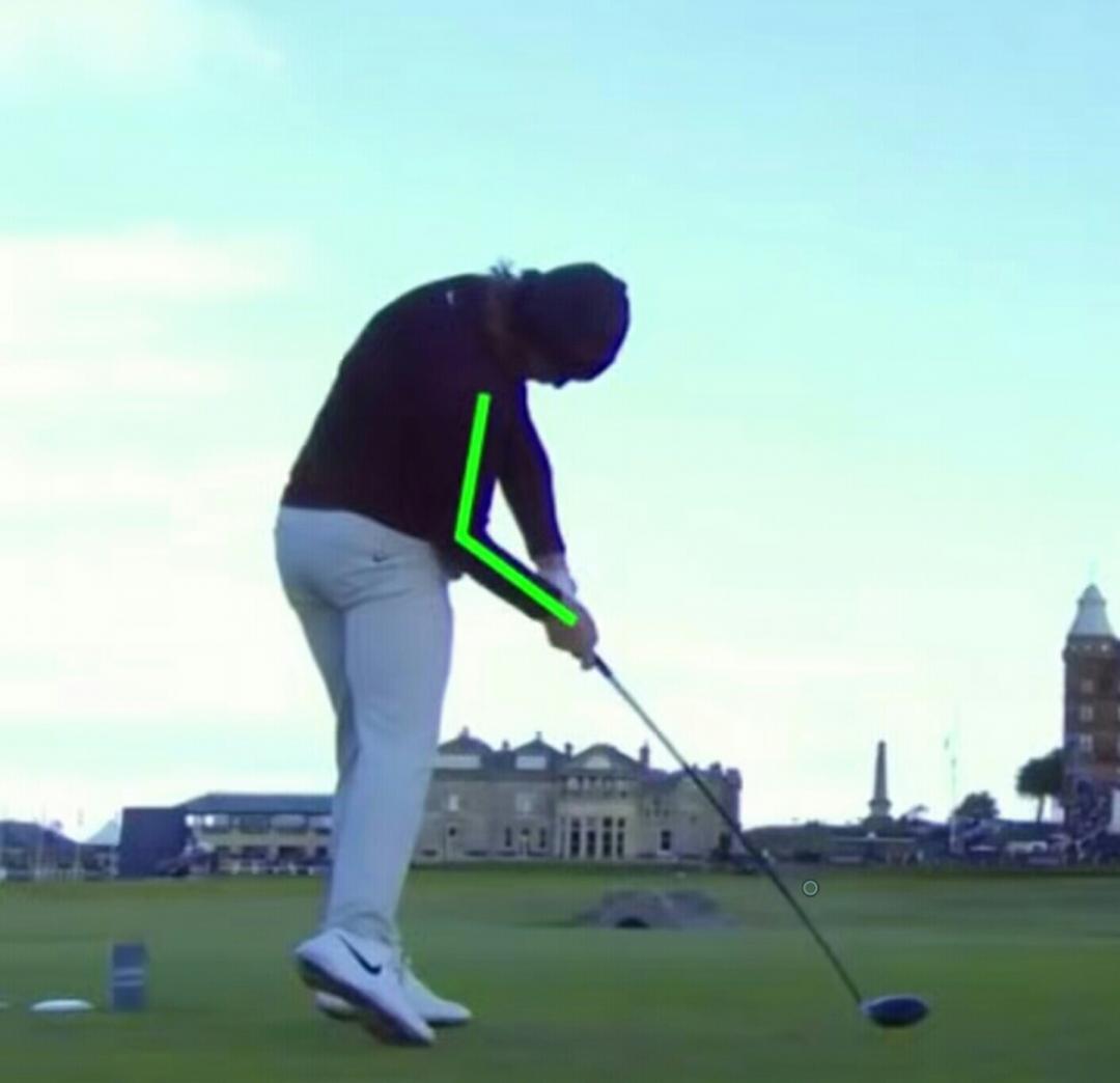 그림에서 보면 임팩트 직전 오른팔이 구부러져 있고 왼팔은 당연히 펴져 있습니다.