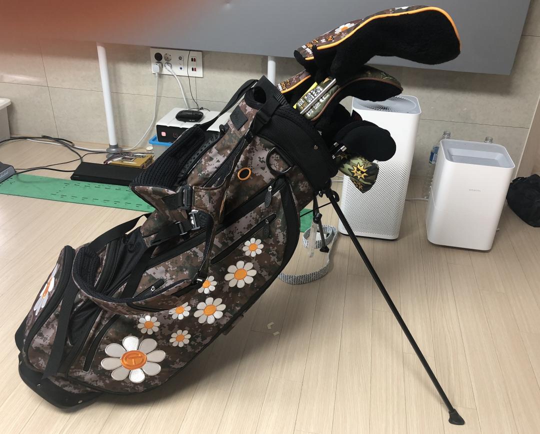 가방은 타이틀리스트 저렴한 모델로 보이며, 프레임에 스카티 커스텀 샵에서 오바로크를 친 커버를 씌운