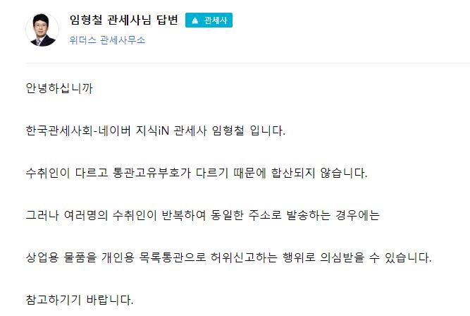 각각 배송해서 같은날 통관 심사를 하게 되면