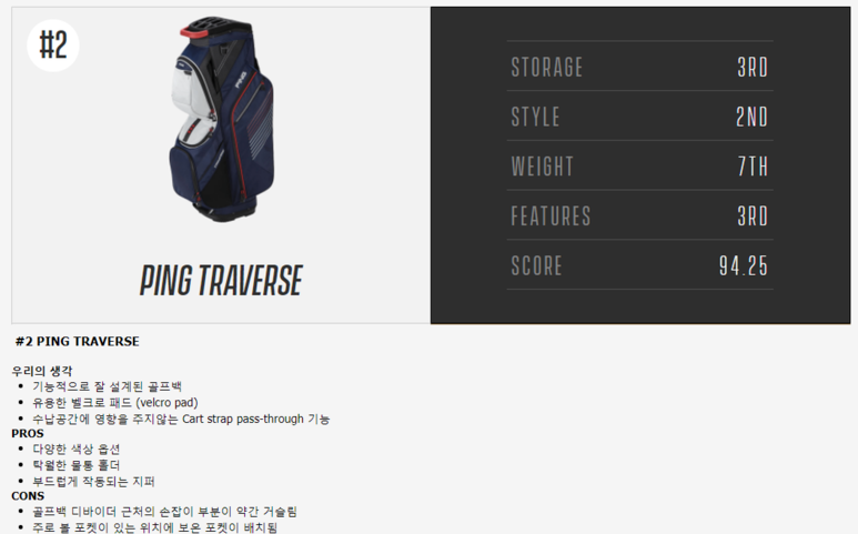 이 골프백의 특징은 마이스파이골프에서 2018년 3위로 선정된 백이고 언급한 것을 보면