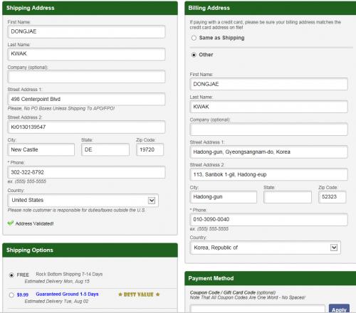 주소는 2개 모두 가능합니다. 배송 선편은 CA로 보내야 하더군요. order number 적고, 나중에 shipping 되는대로 tracking number 오마이집에 적어줘야 합니다. 일단 적고 나서 저장하고, 잘 모르는 거 있으면 서울 센터에 전화해서 신청서가 제대로 됐는지 봐 달라 하면 됩니다. | ||
