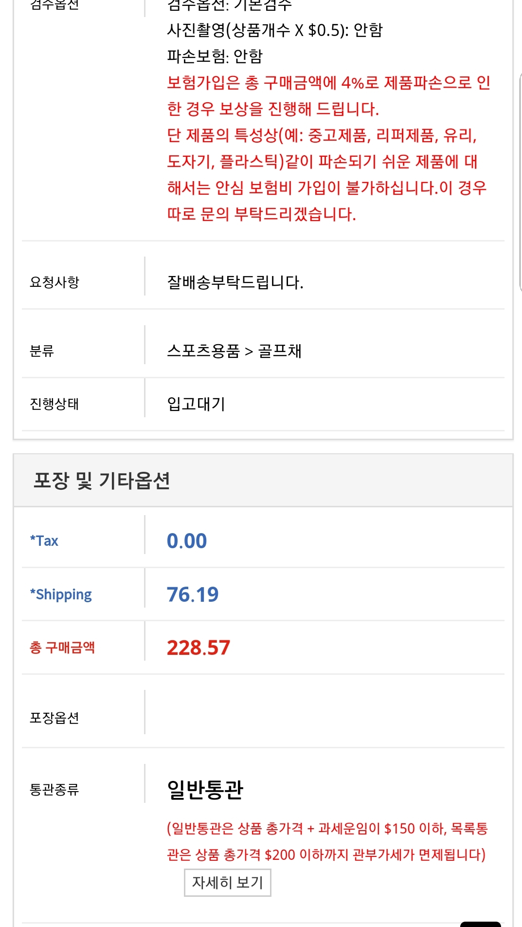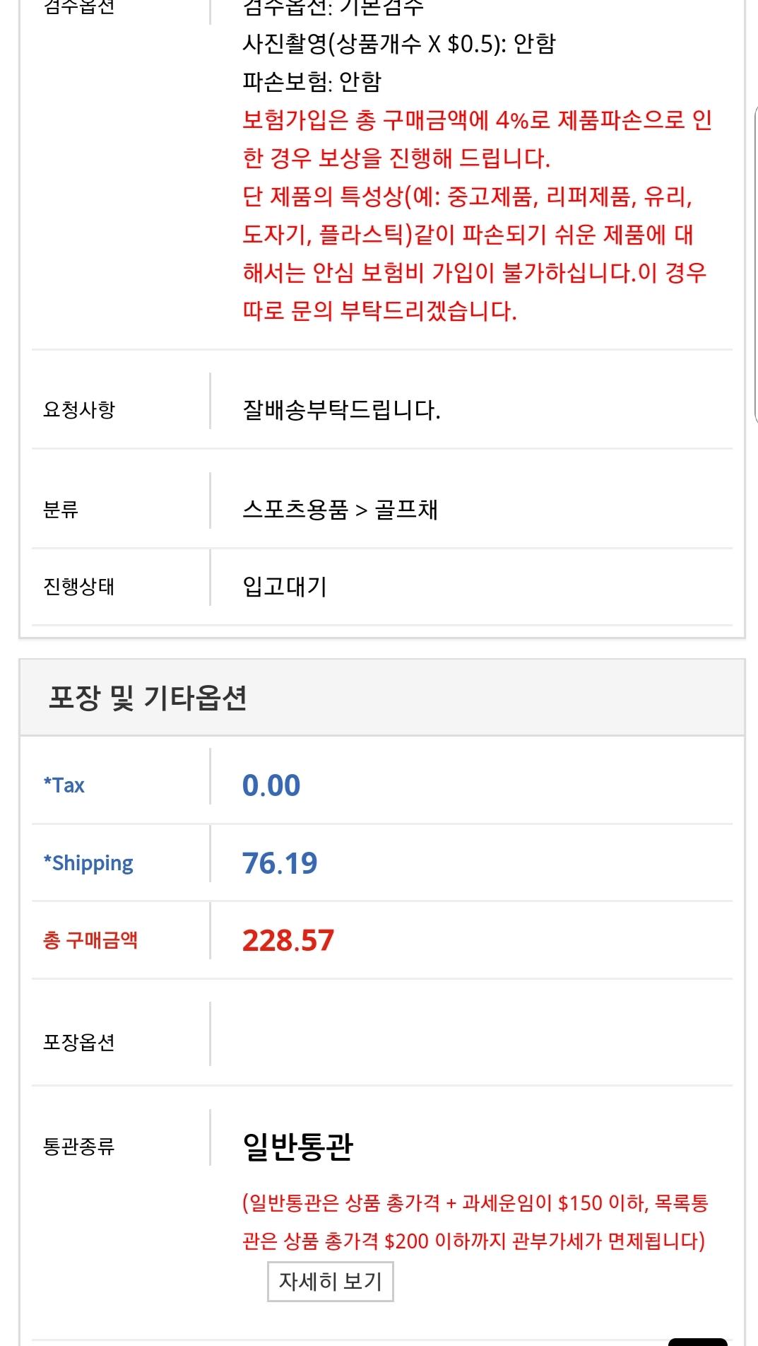 스포츠용품-골프채니깐 목록통관은 잘 적용하셨는데....쉬핑 금액을 잘못 적으면서 200불 넘어가서 일반통관으로 바뀐거 같네요. 웨지 2개면 박스가 조금 작아서 15불 내외니깐 관세 내지 않으셔도 될 겁니다. 목록통관 선택했는지만 확인하세요. |