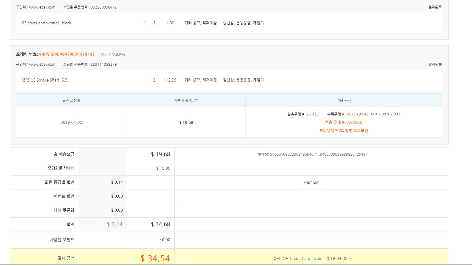 저렇게 추가되는건 일반배송비에 중형화물 배송비... 그러니까 국내배송비를 2번 징구한거 아닌지 의심되네요.