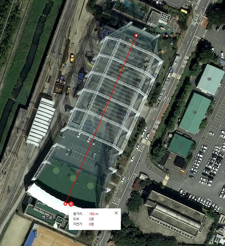 위에 사진이 제가 다니는 연습장 위성사진이고 다음 지도상으로 봤을 때 타석에서 그물끝까지 150m가 나오는데요...