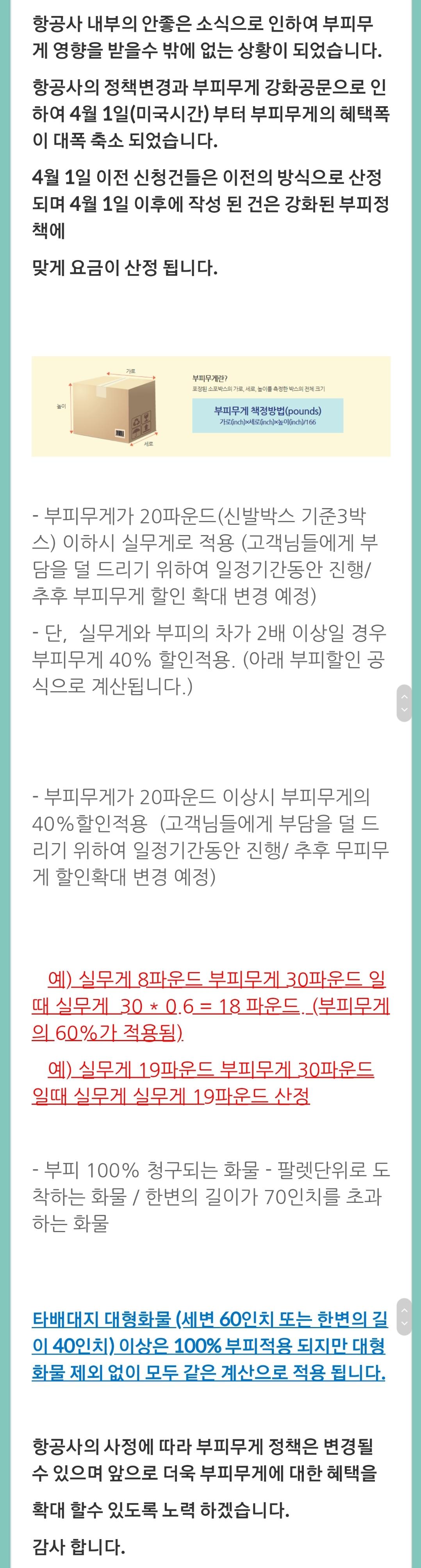 여기 공지사항에 따르면 항공사 정책변경으로 부피무게 면제 조건이 까다로워진다고 되어있네요.