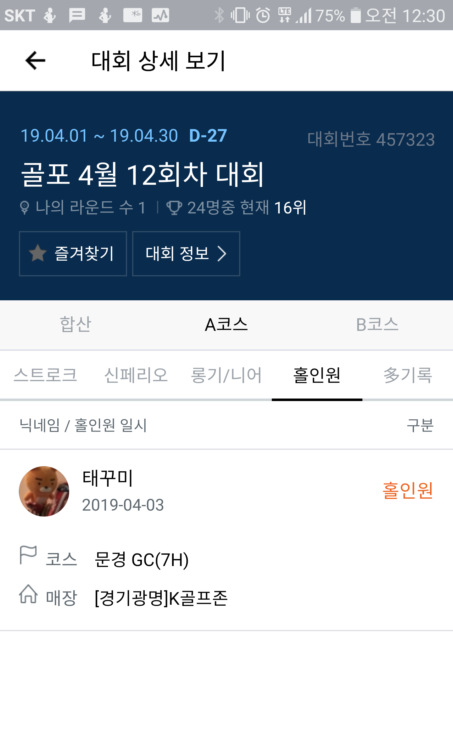 아하 태꾸미 님이시군요 ㅎㅎ A코스에서 화려하게 기록을 롱기니어 홀인원 다 기록이 ㄷㄷ;;