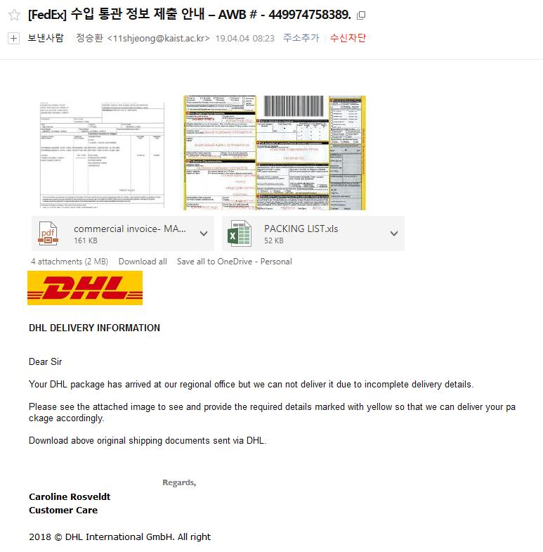 랜섬 스팸메일이 기승이에요 요즘 회사메일로 하루한개씩 받는 데 첨엔 경찰서 법원 외교부 이러다 요몇일은 dhl사칭이 옴... 보낸사람 메일주소를 항싲유의해야합니다 |