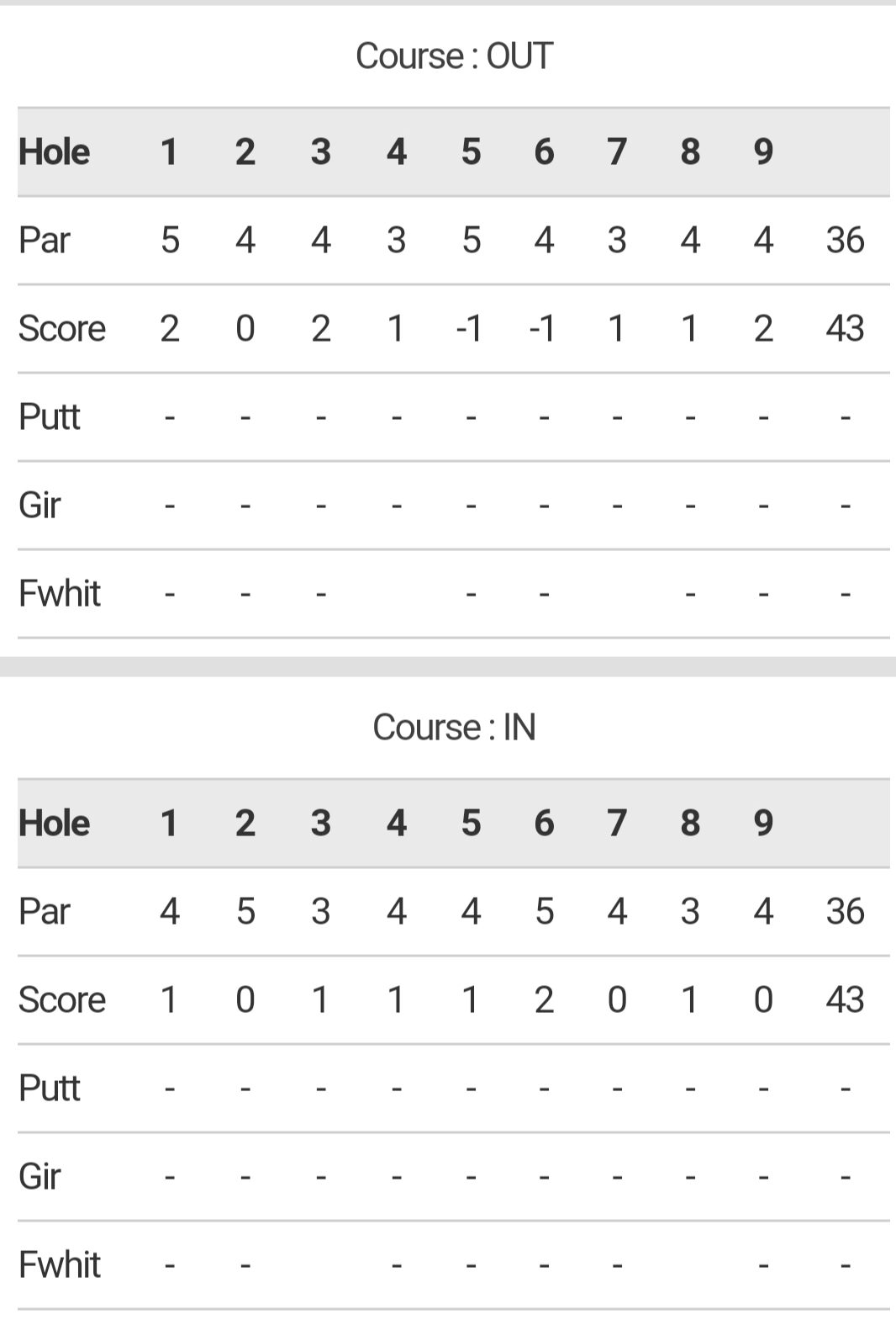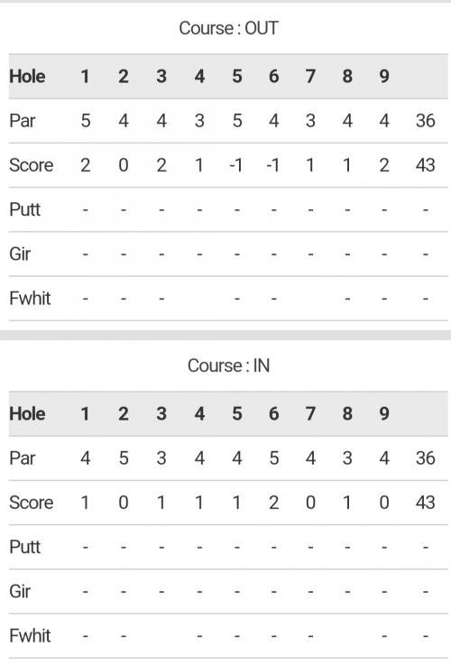 결과는... 같이 친 형님들을 제치고 1등을 하고 말았습니다. 형님들이 허탈해 하셔서 민망했네요. 전반 후반 각 43타씩 86타가 나왔습니다. 일파만파 적용하지 않고 컨시드도 한 클럽 이내서만 받았습니다. 연습 삼아 넣어보기도 했고요 :) 멀리건은 전후반 한 개씩 썼습니다.