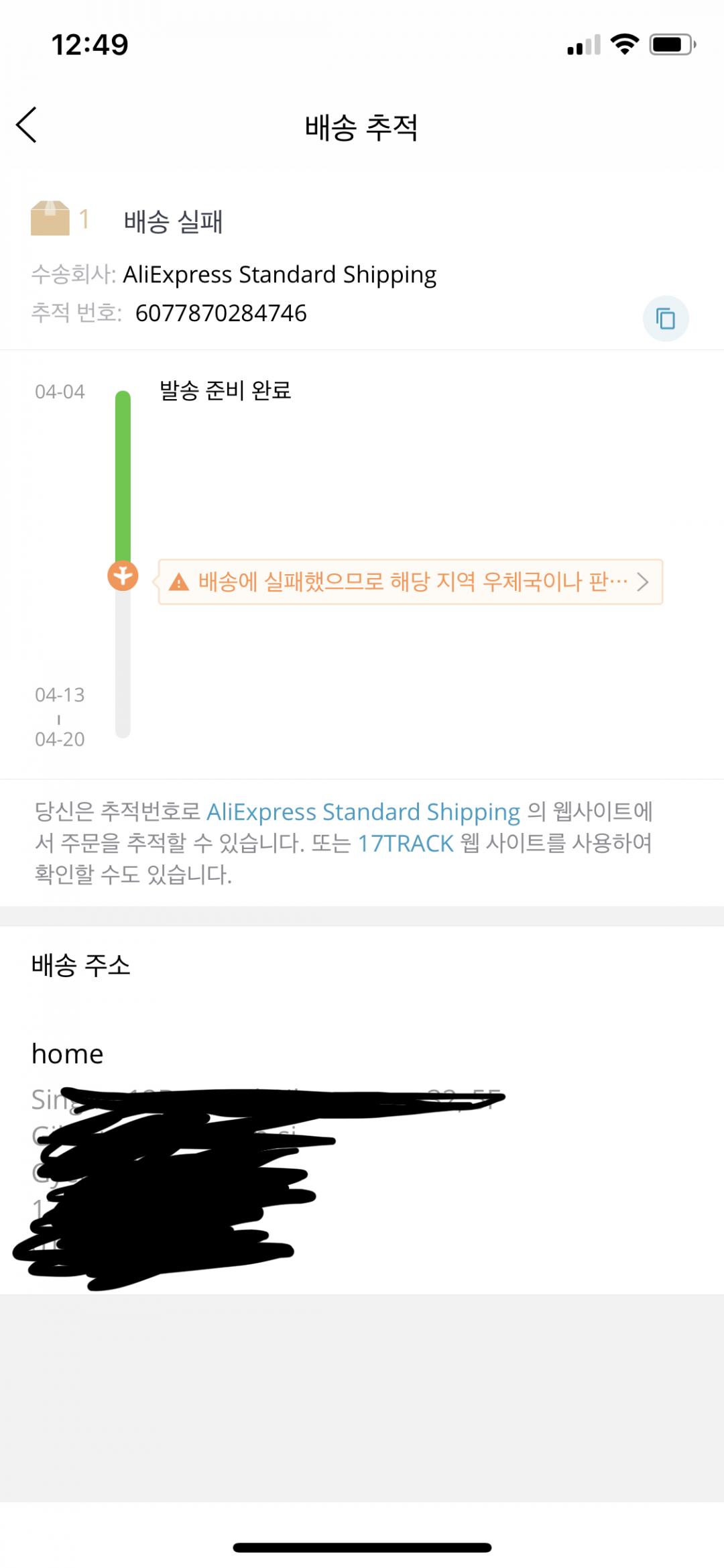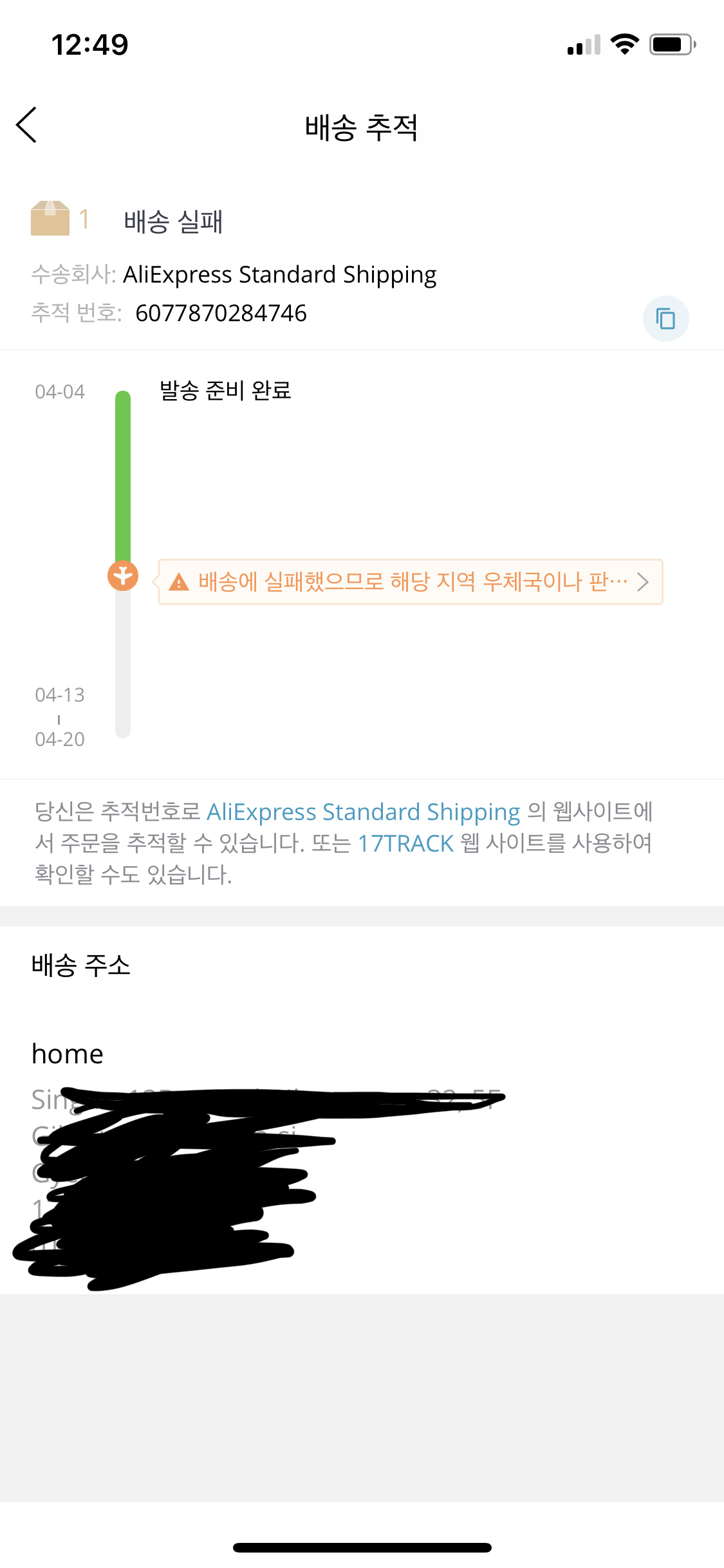 알리에서 배송상태 조회하면 배송실패로 나오는데, 다행히 오늘 수령했습니다.