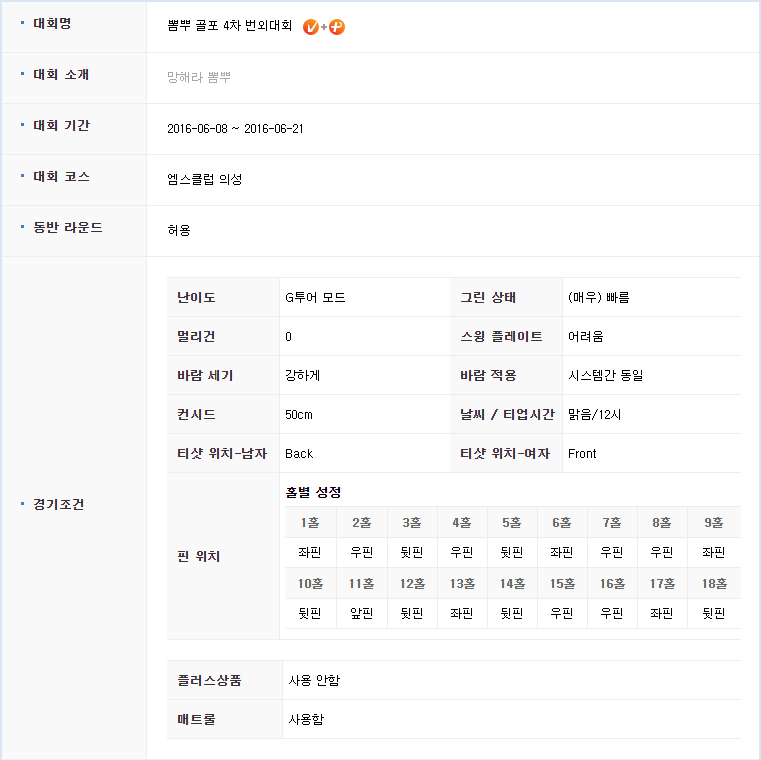 대회가 흥했으면 좋겠어요.. 백티만 해도 +10은 충분 하던데.. 매빠에 컨시드 50... ㅎㄷㄷ |