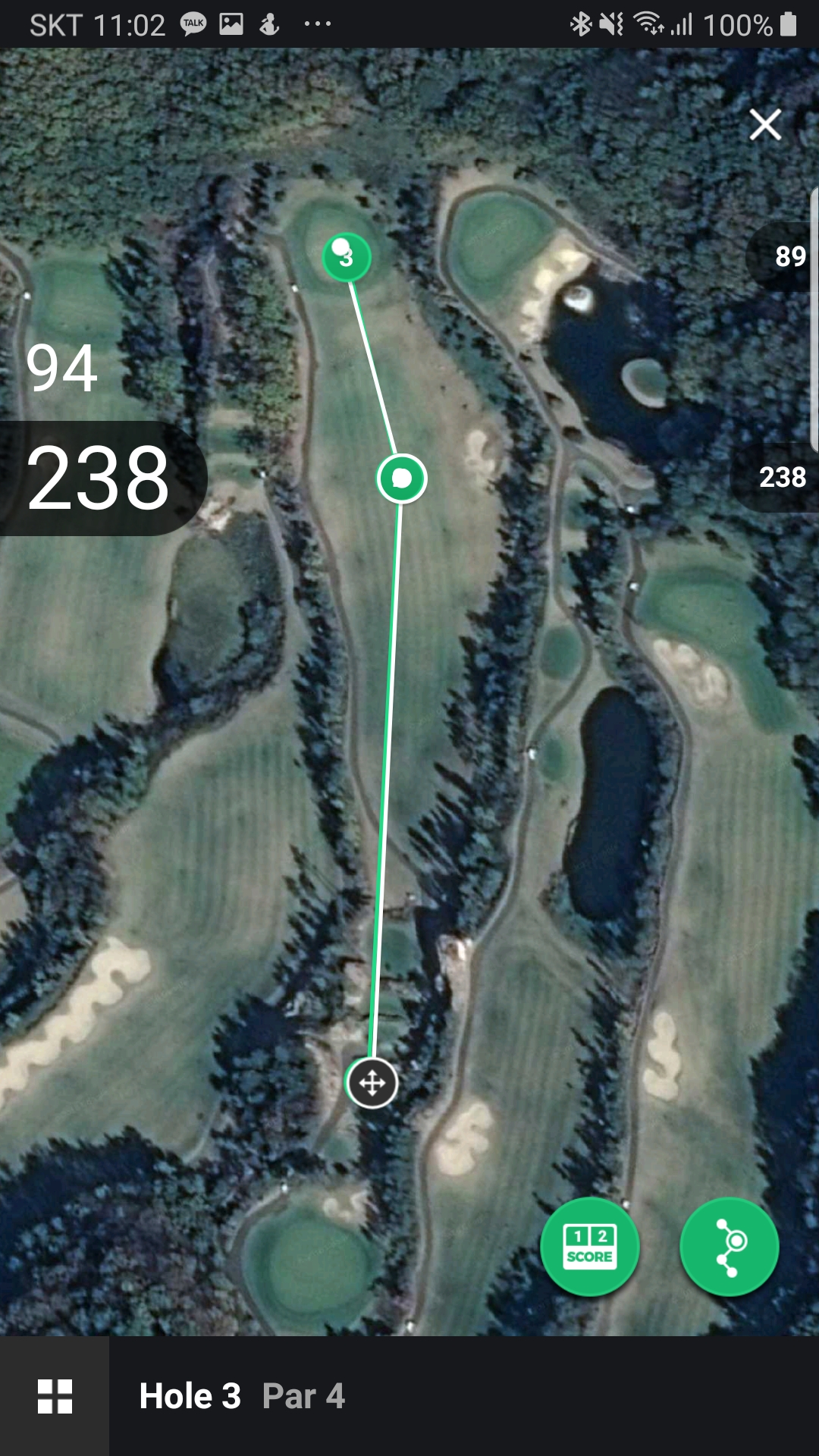 다시 아래미이지로 복기를 해보면 드라이버는 238미터(아마도 내리막 --;) 세컨샷은89미터를 갔네요.