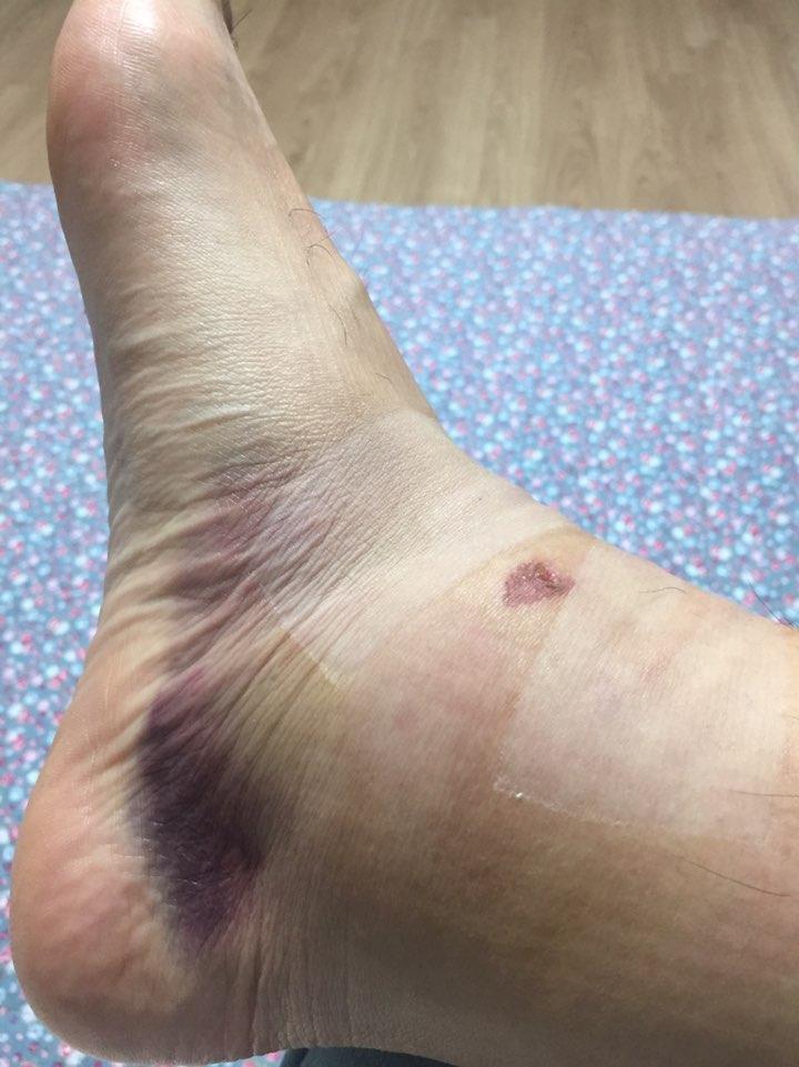 3일 후 발목 상태 입니다. (맞기는 복숭아뼈에 맞았는데 멍은 왜 아래로 드는지....?)