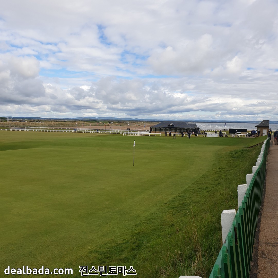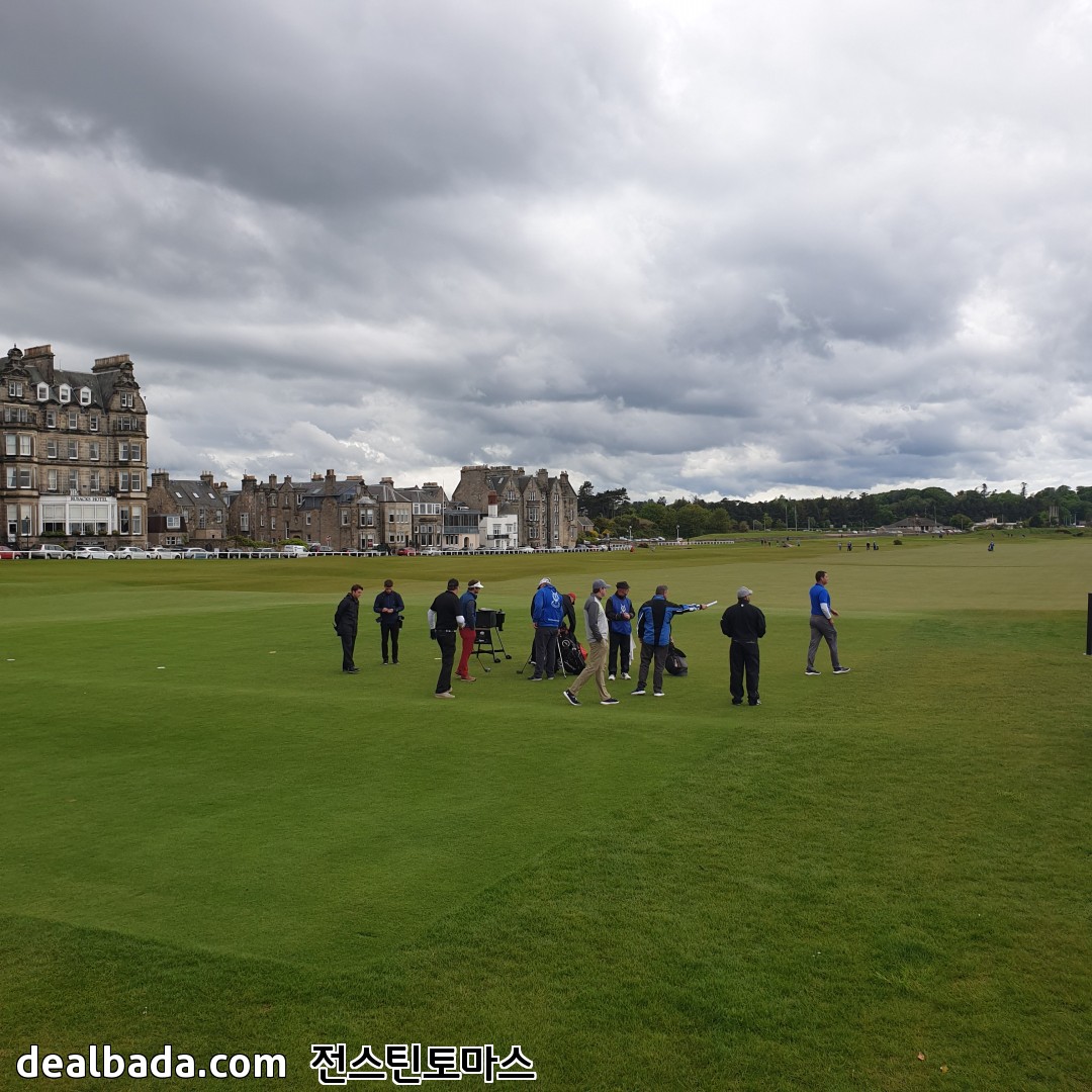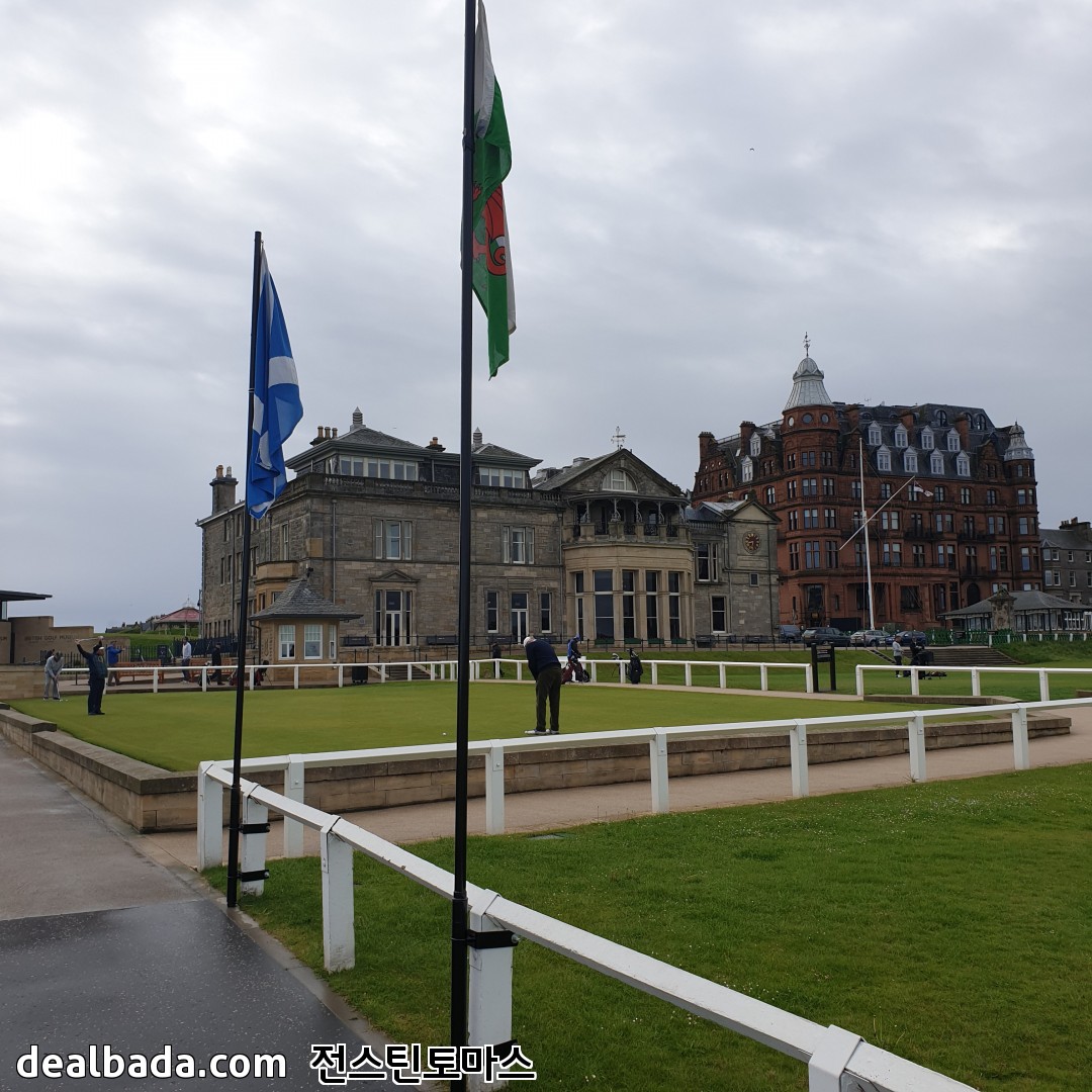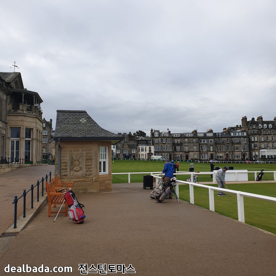 버스에서 내려서 한 골목 안쪽으로 들어가면 바로 세인트 앤드류스 올드코스가 펼쳐집니다. 사진에서 보이는 쪽은 18번홀 그린을 향하고 있고 가운데 건물이 R&A 건물인데 회원만 출입할 수 있게 엄격히 제한된 곳이었습니다. 그리고 18번홀 옆에는 바로 1번홀 티박스가 있습니다. 즉 18번홀 왼쪽은 1번홀 티박스 오른쪽은 차들이 주차된 도로와 건물들이 바로 붙어있습니다. 제가 가면 유리창을 깨거나 1번홀로 위험신호를 보내야 할 지도 모르겠군요. 올드코스 예약하려면 공식핸디가 있어야 한다더니 꼭 필요할 것 같습니다 ㅋㅋ