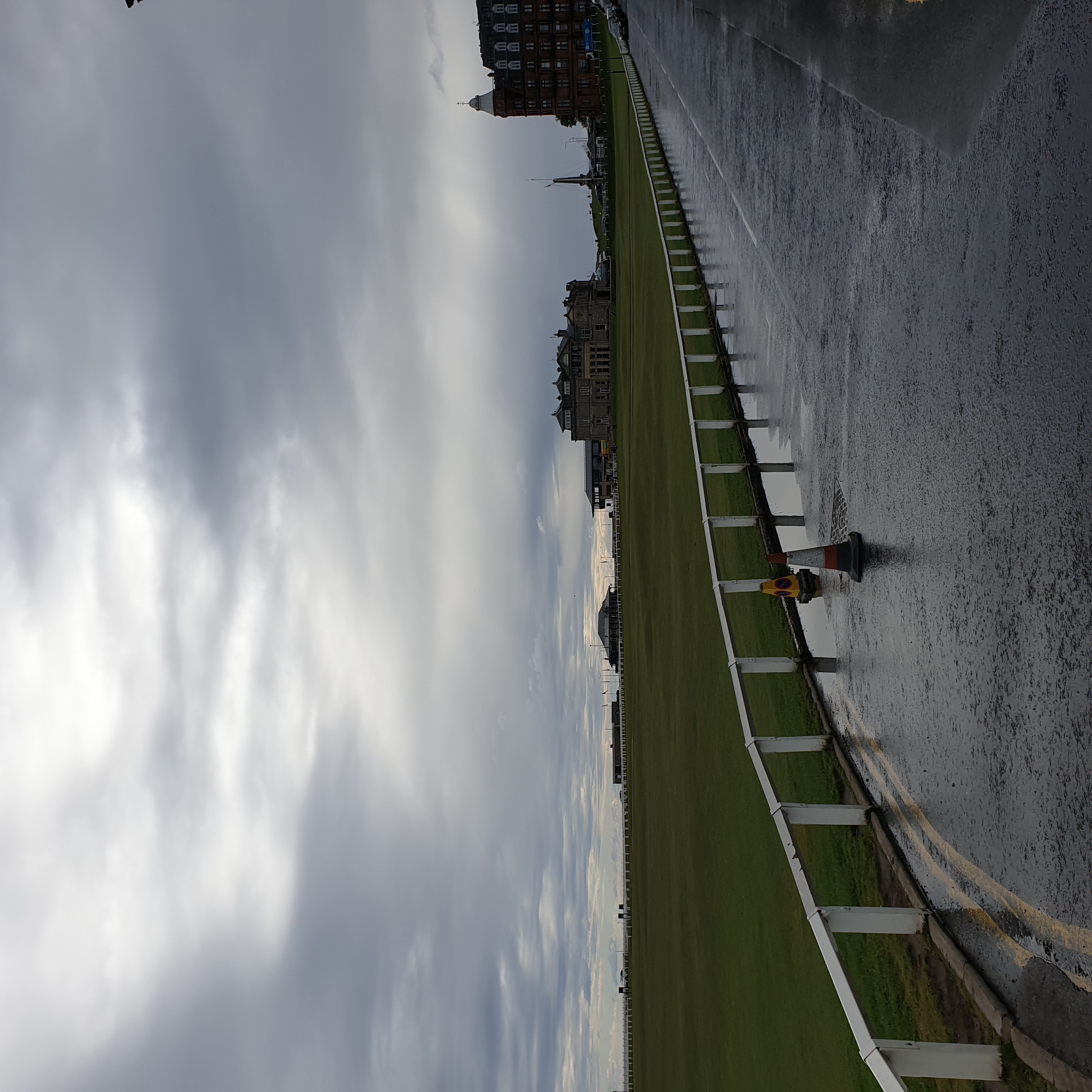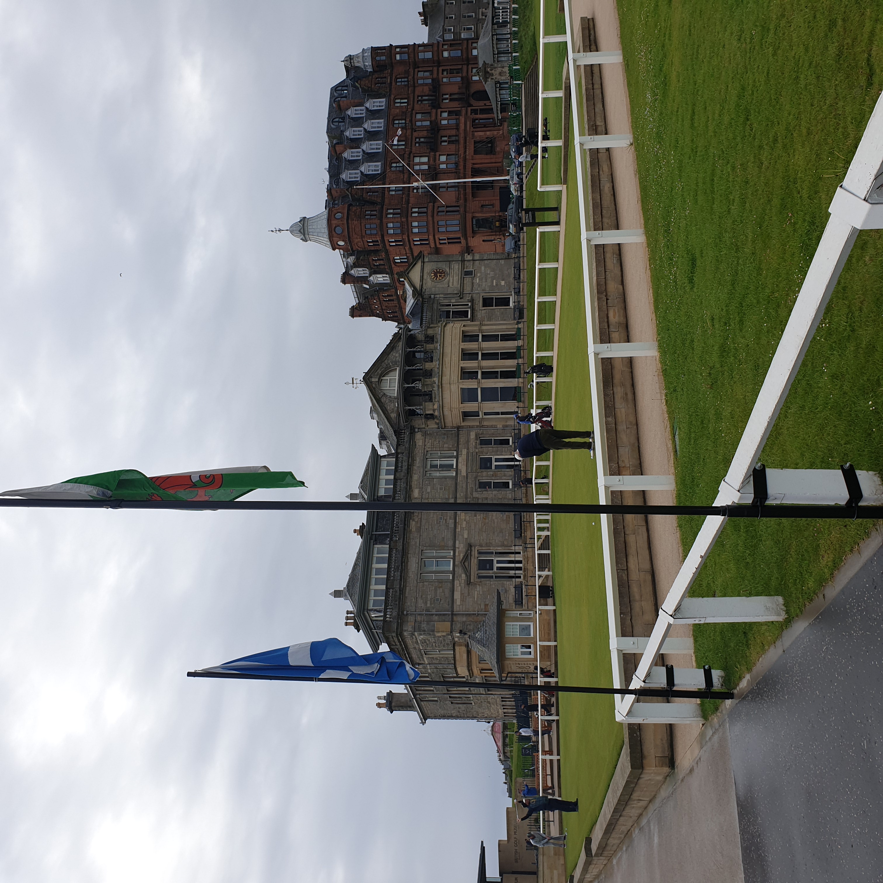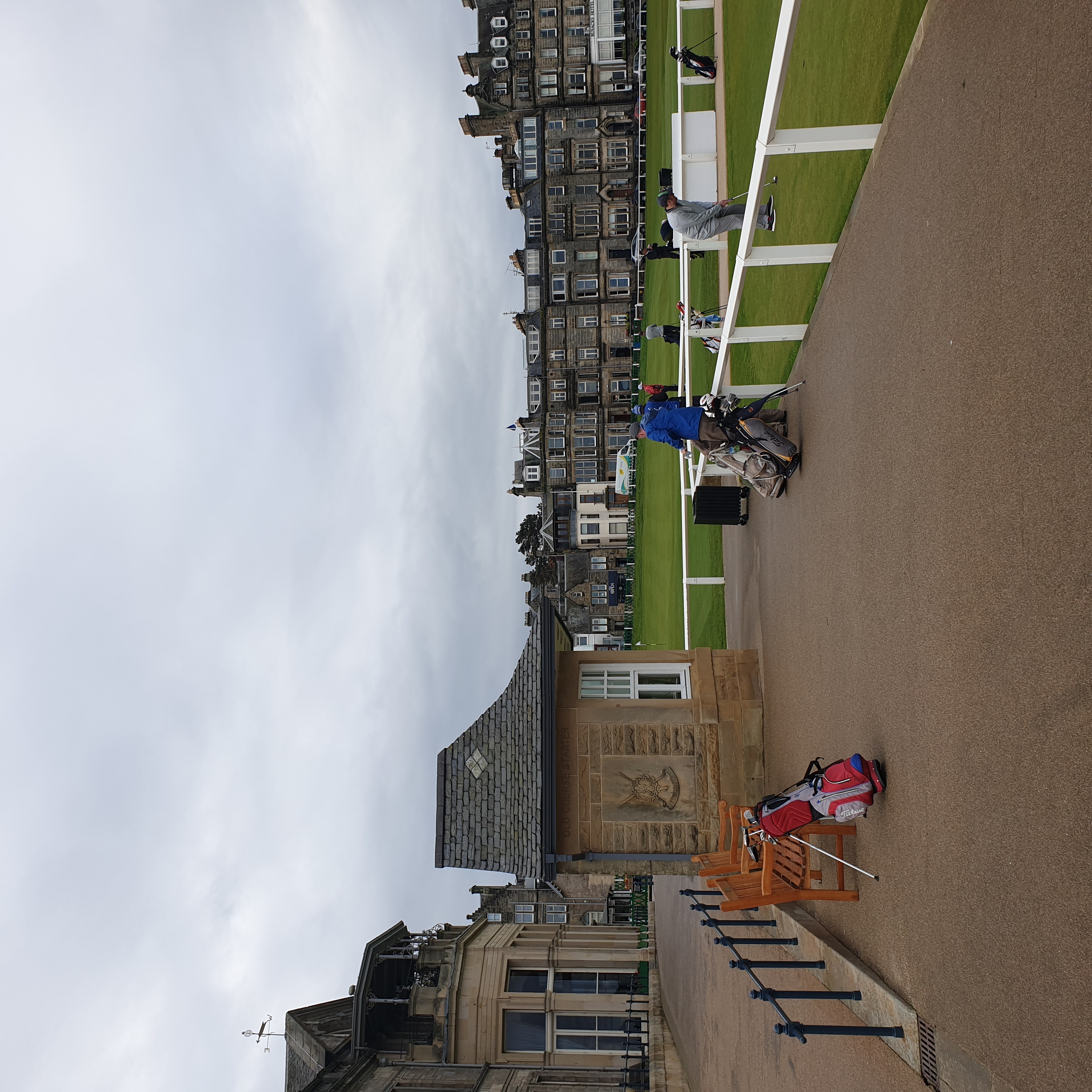 버스에서 내려서 한 골목 안쪽으로 들어가면 바로 세인트 앤드류스 올드코스가 펼쳐집니다. 사진에서 보이는 쪽은 18번홀 그린을 향하고 있고 가운데 건물이 R&A 건물인데 회원만 출입할 수 있게 엄격히 제한된 곳이었습니다. 그리고 18번홀 옆에는 바로 1번홀 티박스가 있습니다. 즉 18번홀 왼쪽은 1번홀 티박스 오른쪽은 차들이 주차된 도로와 건물들이 바로 붙어있습니다. 제가 가면 유리창을 깨거나 1번홀로 위험신호를 보내야 할 지도 모르겠군요. 올드코스 예약하려면 공식핸디가 있어야 한다더니 꼭 필요할 것 같습니다 ㅋㅋ