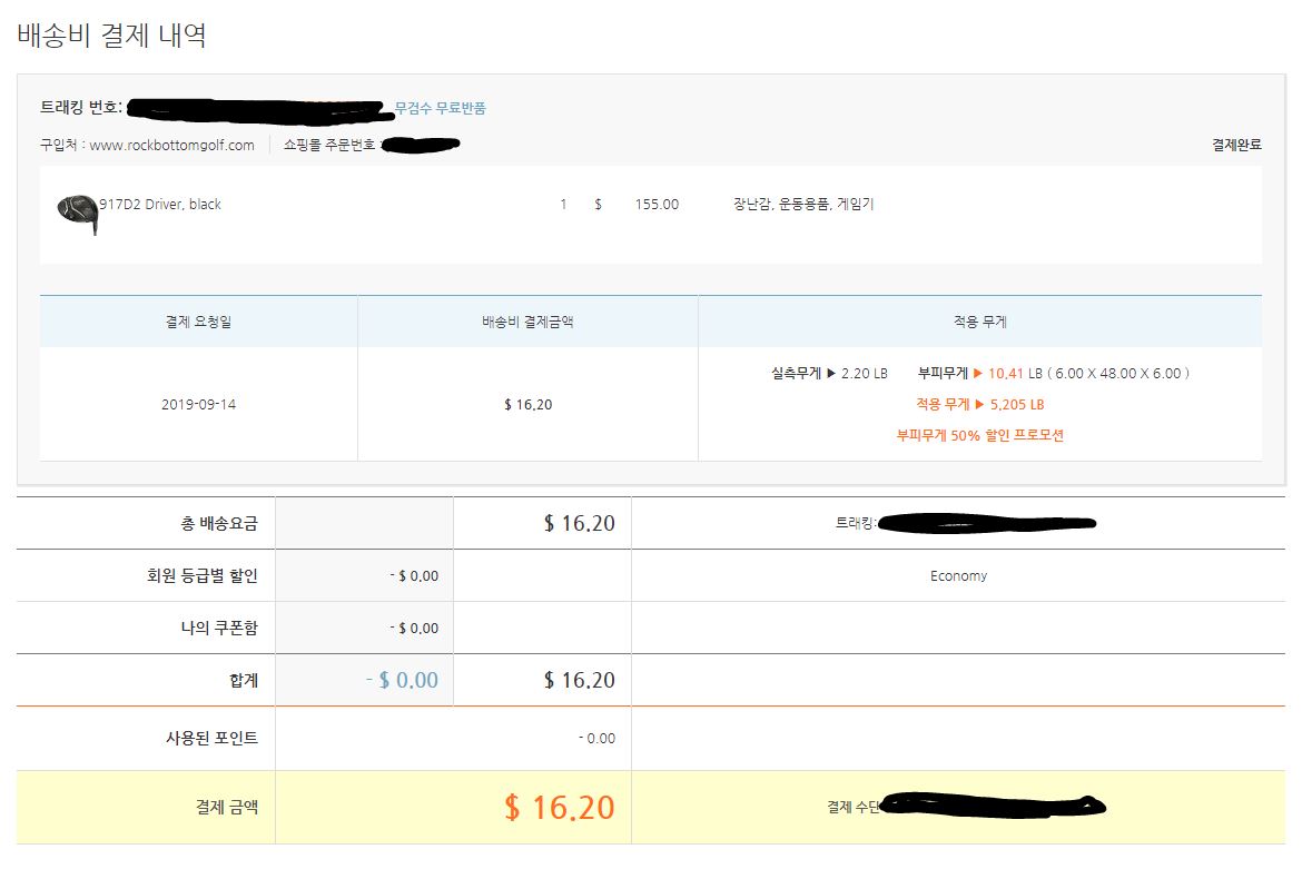 퍼터 받을 때 몰테일 썼는데.... 국내에서 중형화물비 받더라구요. 그 뒤로 오마이집 통해서 페어웨이 우드 샀을 땐 중형화물비 없었구요.. |