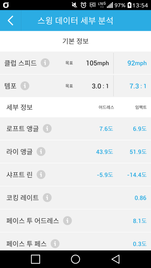 저도 사용중인데 이게 은근히 정확하더라고요 ㅎㅎ 특히 어드레스와 임펙트 때 로프트 각도 비교나 레깅 거리, 백스윙 다운스윙 궤도 등 유용한 분석이 많습니다 ㅋㅋ 저거 느낌표 하나하나 눌러보시면 어떻게 써먹어야 하는지 나와요~ |