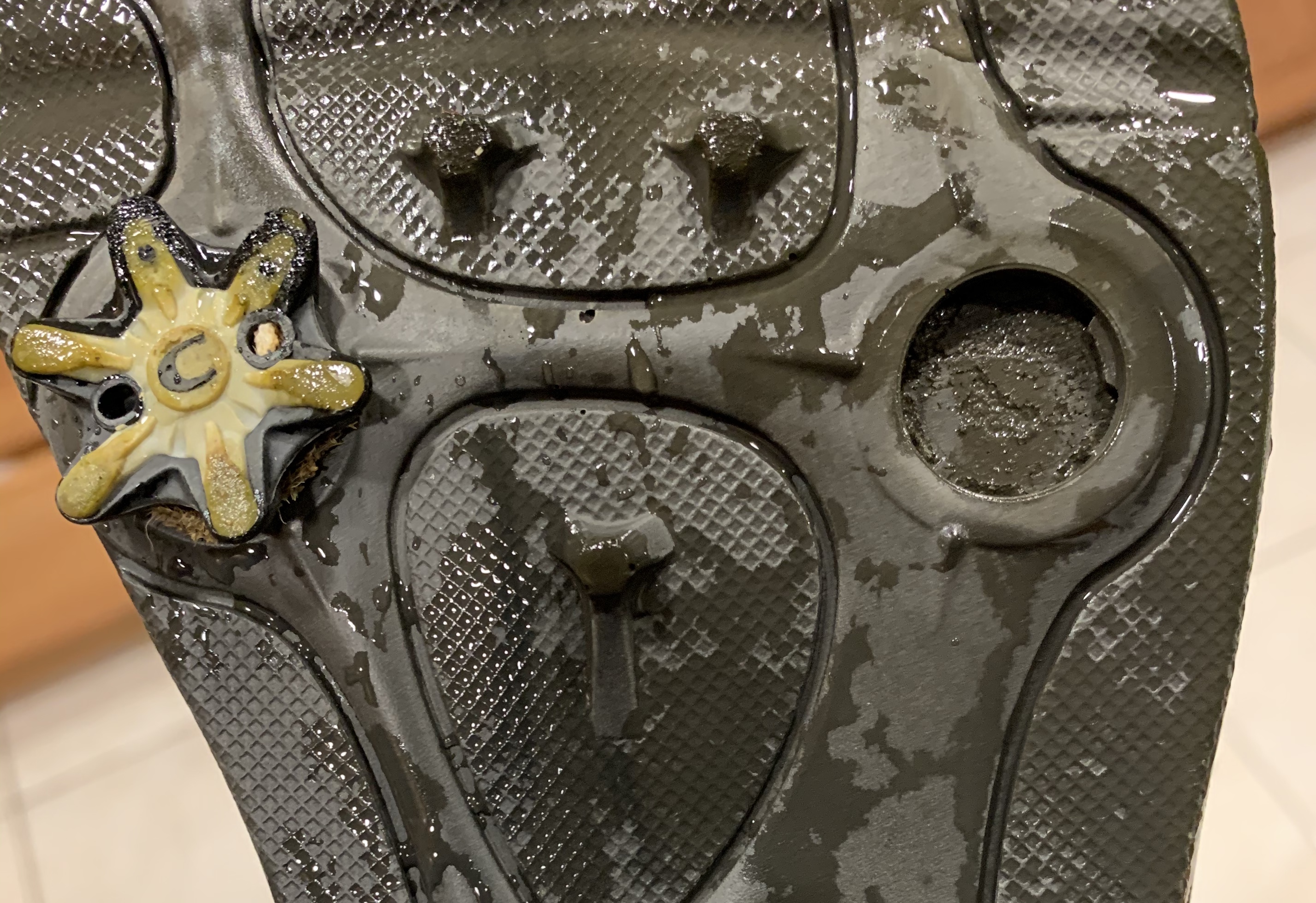 지난 일요일 36홀 라운딩을 끝내고 신발을 벗어보니 스파이크 하나가 떨어져 나갔더라고요.