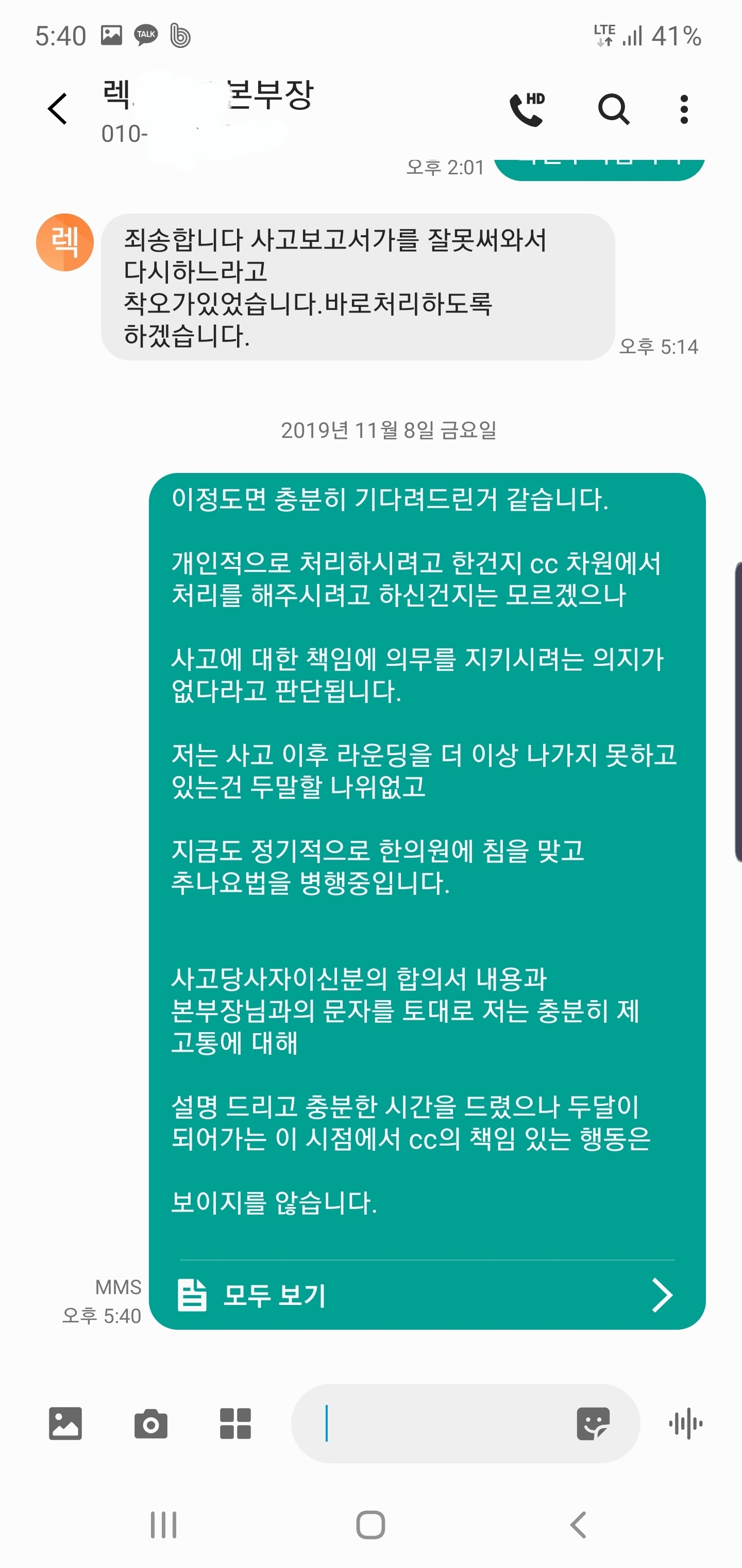 cc측에서는 보험처리를 하도록하겠다고 해서 그러자 라고 했습니다.
