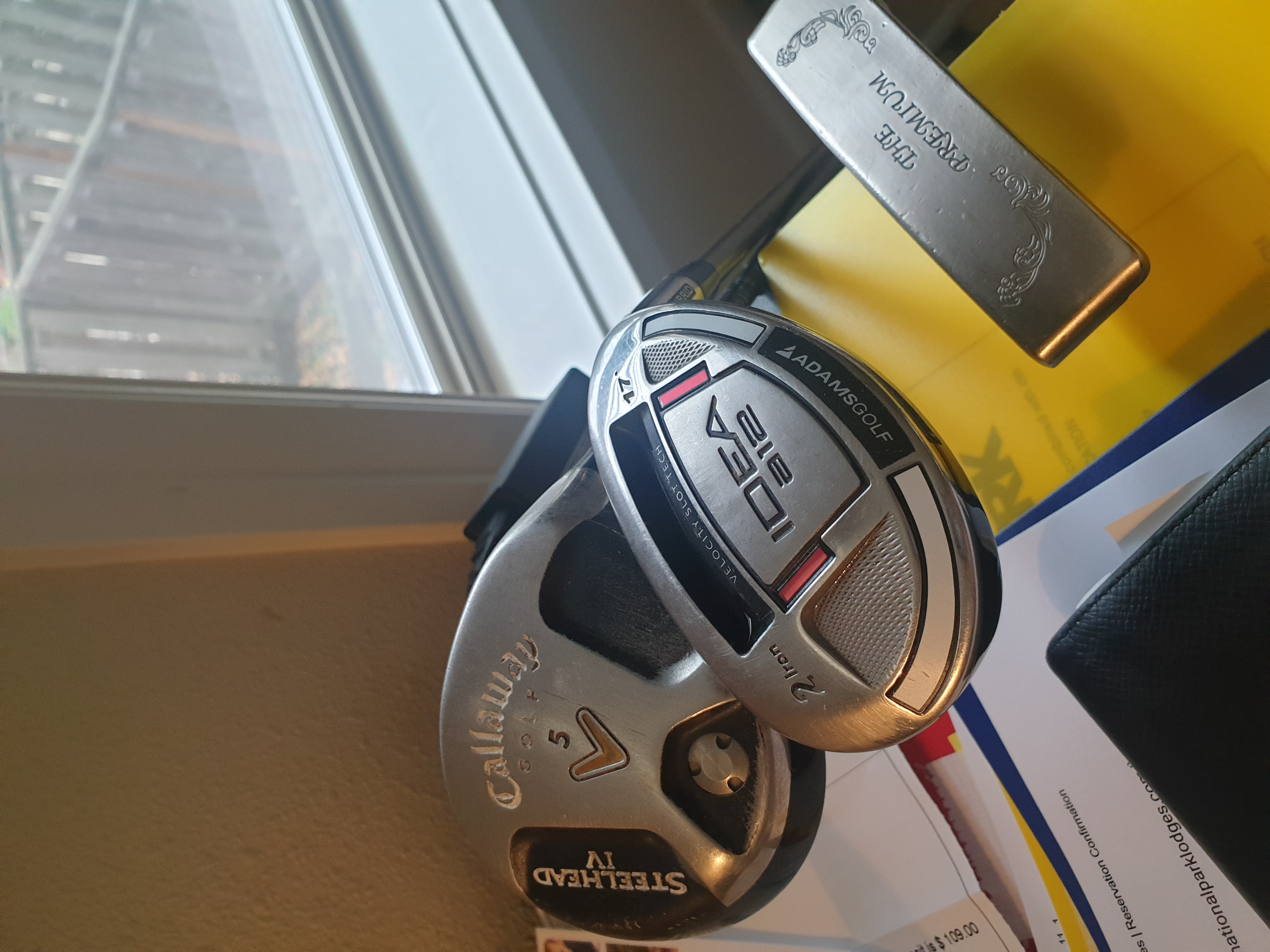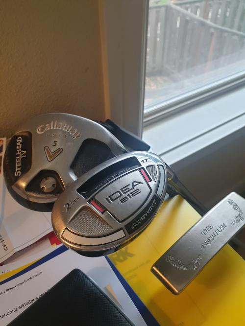 친구한테 받은 캘러웨이 5번 우드, 선배한테 받은 히로 마쓰모토 퍼터, 동네 피팅샵에서 5만원 주고 산 아담스 하이브리드 3총사입니다. 따지자면 안맞는 건 아니지만 뭐랄까, 어떻게 표현할 순 없지만, 그냥 새걸로 바꾸고 싶네요 ㅠㅠ