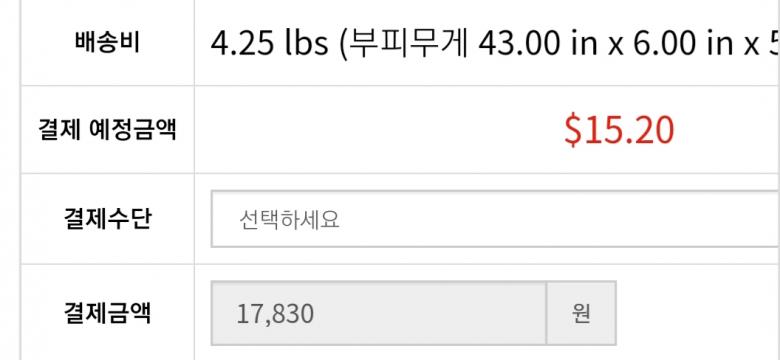 무게가 7.77 lbs (부피무게 5.00 in x 6.00 in x 43.00 in) 로 되어 있습니다