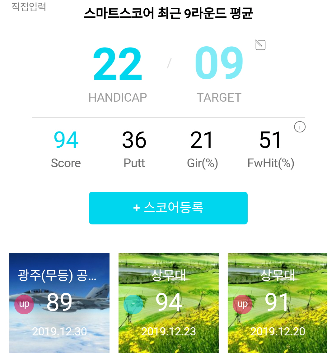 9월 첫 라운딩에서 120타를 시작으로 계속 100타 이상... 90대 스코어 기록하기가 너무 힘들었습니다.