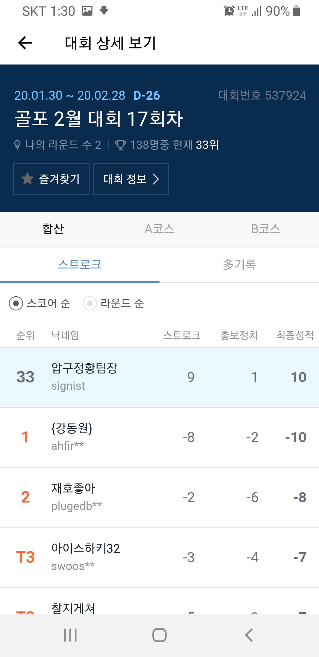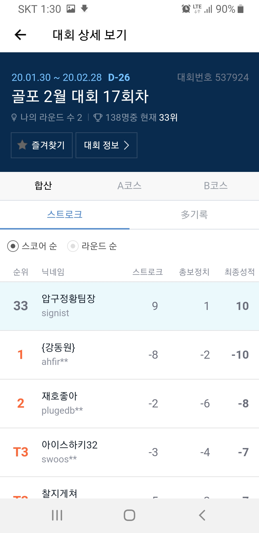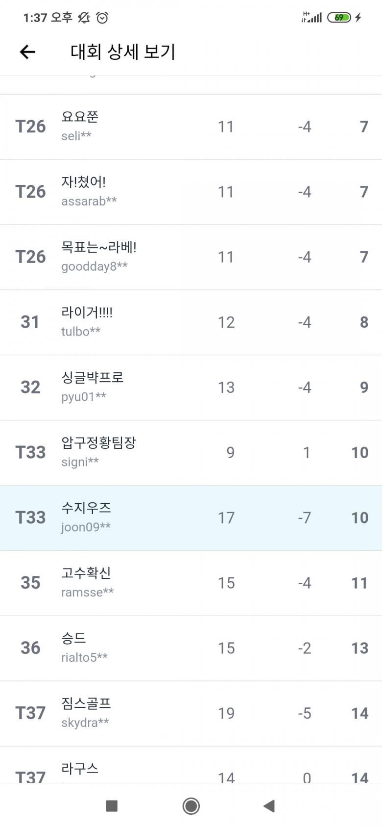 저 상태에서 누군가가 9오버를 기록하면, T32가 될 것 같은데...