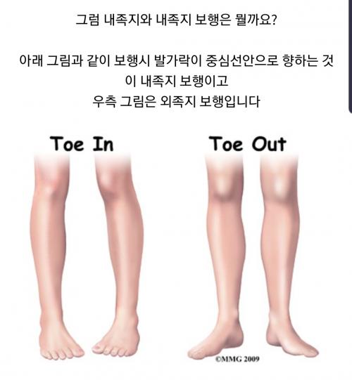 위의 그림 보시면 내족지보행과 외족지보행이 있습니다. 편하게 걸을때 발끝이 모아지며 약간 여자걸음처럼 걷는 분은 내족지보행을 하고 계신거고, 발끝이 벌어지며 조금 팔자걸음 느낌 나시는 분은 외족지 보행을 하고 계시는 겁니다. 물론 어느쪽에도 치우치지 않고 걷는 분도 있겠죠.