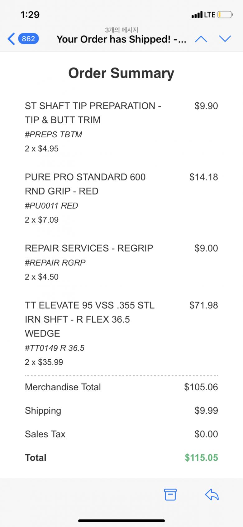 최근 웨지 샤프트 두개 주문한 것 참고하세요. 프렙 비용 그립 장창 비용 다 따로 받습니다. 그래도 국내보다 훨씬싸요.