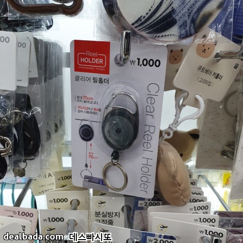 앞의 행주를 반 잘라서 가운데에 흰고무줄을 열심히 바느질 해주고 위의 릴홀더 열쇠고리 부분을 끼우면 완성입니당!!