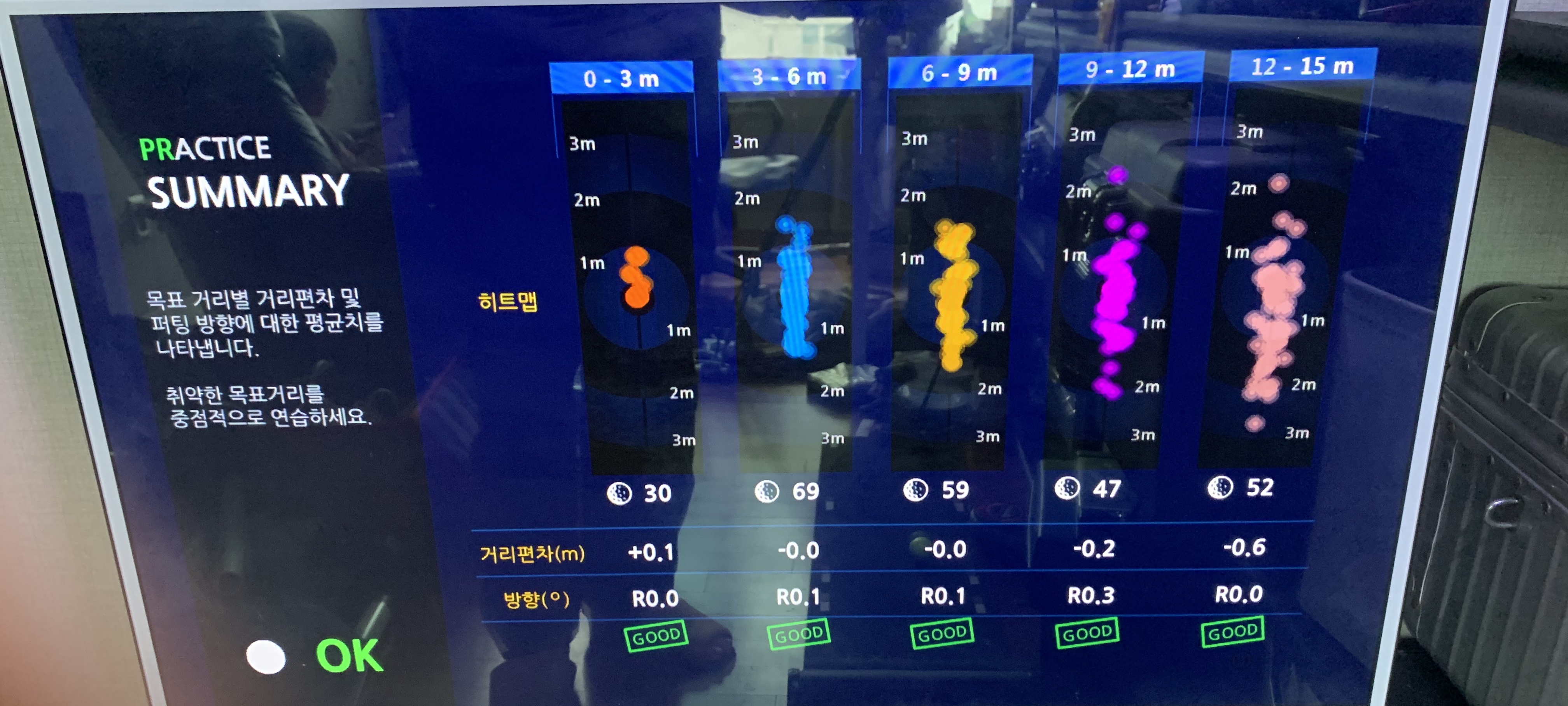 팬텀으로 연습하다가 인서트가 들어간 스파이더 S로 굴려보니 역시 그 인서트의 보정량 만큼 거리가 짧습니다. 템포를 살려서 조금 더 경쾌한 스트록이 나은 결과를 내긴 하는데 아직 익숙하진 않네요 ㅎ