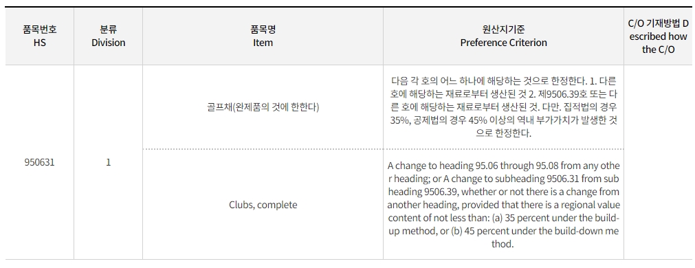 한-미 FTA에서 골프채에 해당하는 9506.31의 원산지 결정기준을 찾아보면 하기와 같습니다.