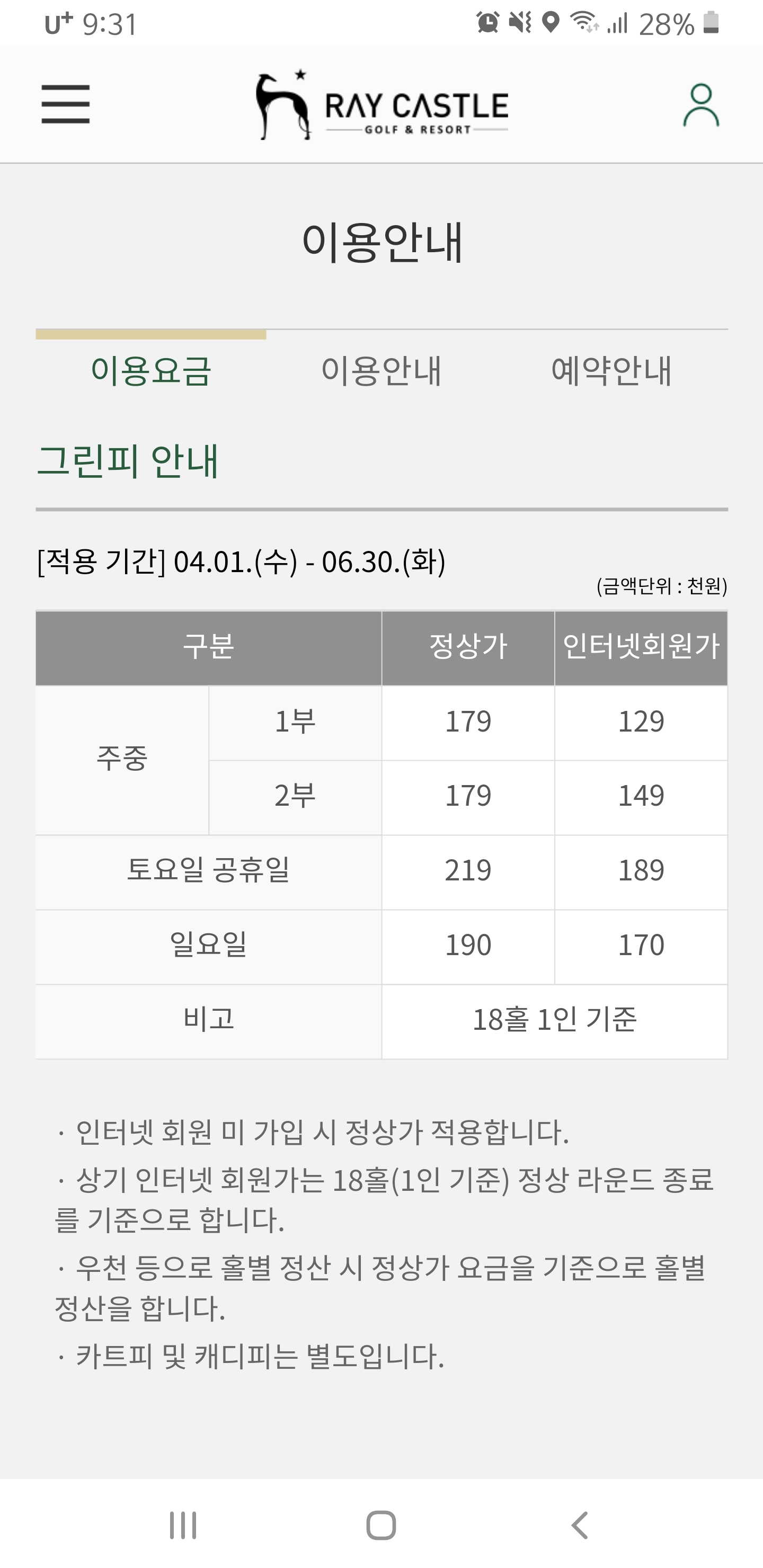 - 그린피, 캐디피, 카트비 등 비용: 1부 129000, 2부 149000