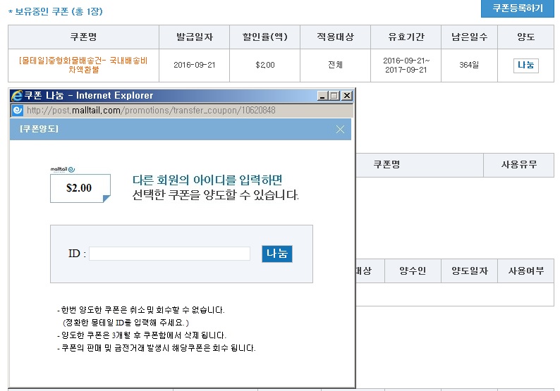 혹시 몰테일 $2 쿠폰 필요하신 분 계시면 쪽지로 몰테일 id 알려주시기 바랍니다. 양도해 드리겠습니다.
