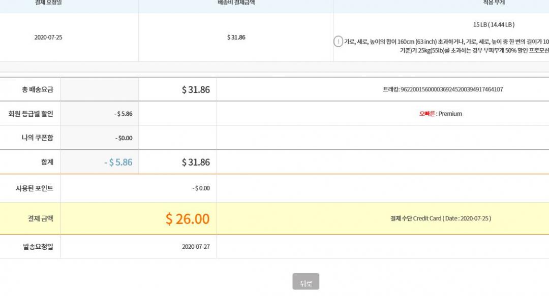 몇일전에 오내집배송비  pxg우드배송비 $31.12