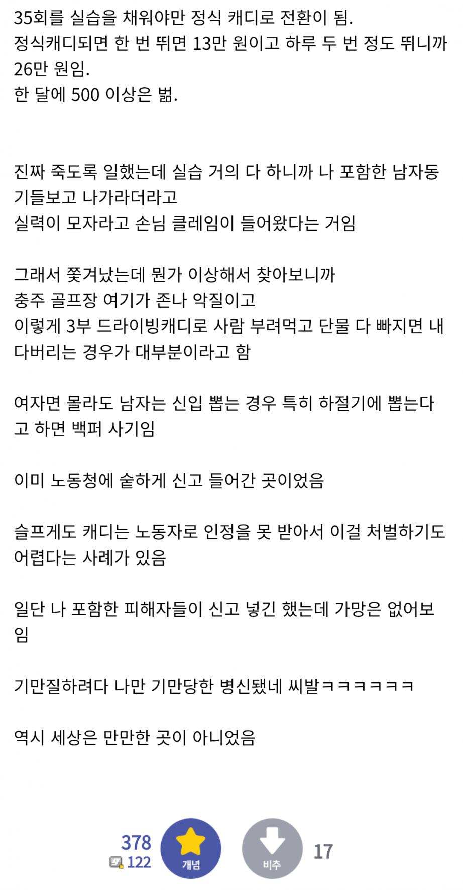 이거 혹시 임으로 시작하는 골프장인가요? 제가 초여름에 3부 갔는데, 대구에서온 순진한 청년이 드라이빙캐디하면서 3개월간 무급? 월급30만원? 이라고 하더라고요. 말이안된다했더니 기숙사+식비제공+교육으로 다 까이고 3개월뒤면 제대로 돈받고 일할 수 있다고 들었다고하네요. 우리가 준 캐디피 다 회사 반납해야한다고도하고.